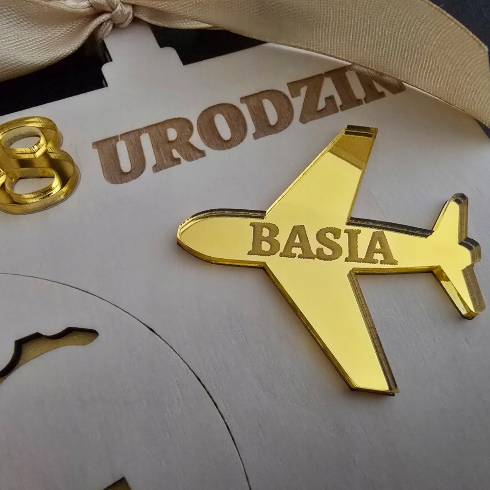 13. Білий та золотий конверт, золота стрічка, цифри та золотий літак