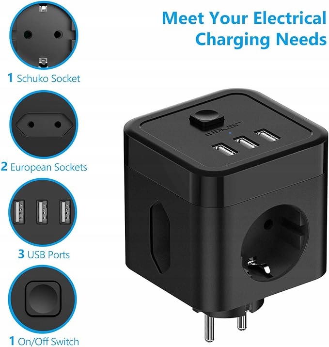 - Потужність: адаптер USB-роз’єму постачається з 1 роз’ємом Schuko, 2 європейськими роз’ємами та 3 портами USB. Це дозволяє заряджати кілька пристроїв одночасно та забезпечує найвищий рівень безпеки, комфорту та надійності.