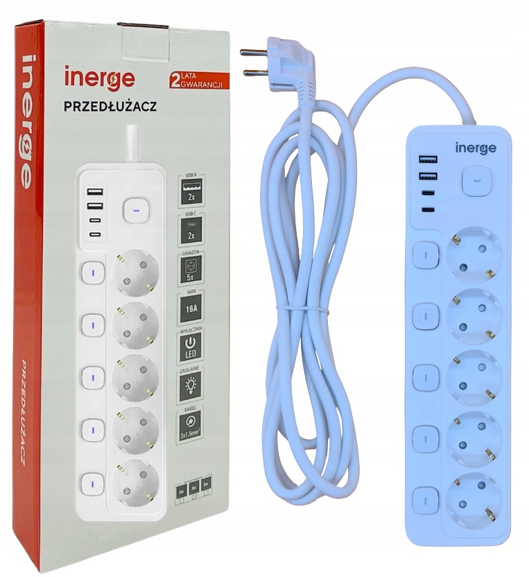 ПОДОВЖУВАЧ ПОДОДОВЖУВАЧА 5 РОЗЕТОК 2 м 4x USB 3x1.5MM² 5x LED ВИМИКАЧ