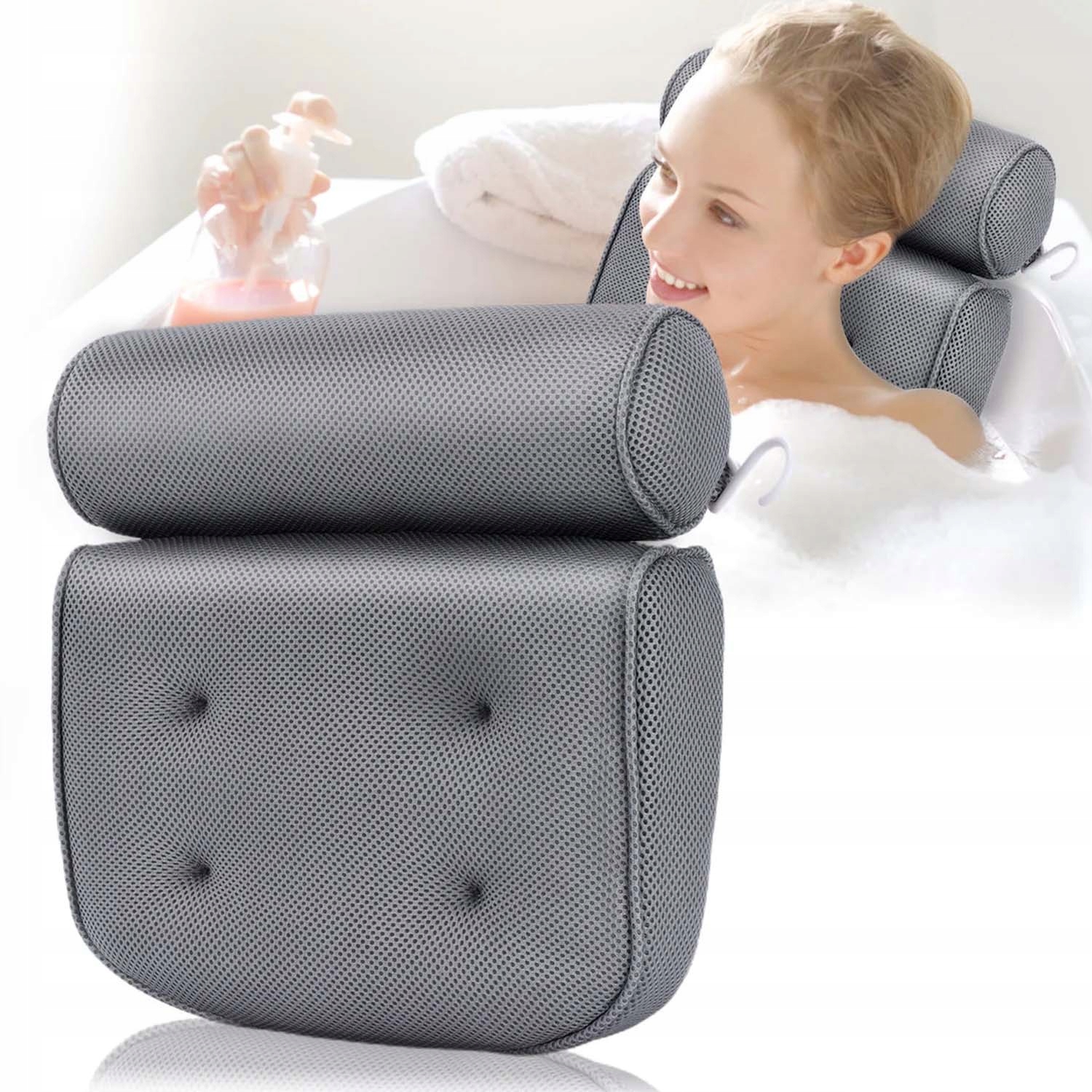 Ця подушка для ванни використовує технологію 4D air mesh, виготовлена з високоякісного матеріалу, що забезпечує хмару м’якості, відмінну повітропроникність і вентиляцію. , що дозволяє воді та повітрю швидко проходити, зберігаючи комфорт шиї, шиї та плечей.