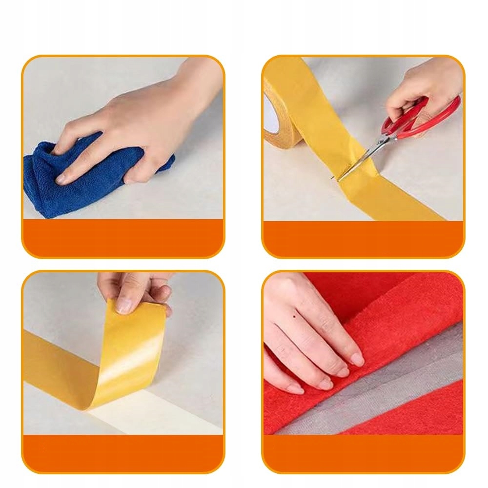 - Висока адгезія - Клейка стрічка була виготовлена з матеріалів з винятковою силою склеювання, завдяки якому вона ідеально тримає килими та накладки на місці, усуваючи проблему їх ковзання на підлозі. 4 В ідеалі підходить для різних поверхонь, таких як плитка, дерево, ламінат або лінолеум. 4