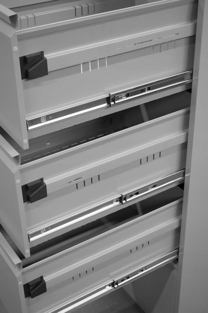 4 ящики, оснащені функціональними відділеннями для підтримки порядку в документах. Ящики, встановлені на суцільних телескопічних посібниках, що дозволяють повному креслення. Захисний механізм дозволяє одночасно відкривати лише один ящик. Це запобігає небезпечному нахилу та підтримує стабільність шафи з розширеними, завантаженими ящиками.