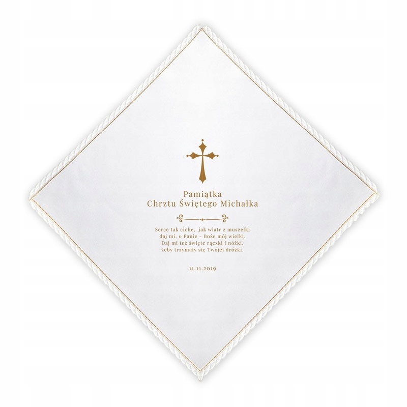 Хрестинська хустка, прикрашена золотим хрестиком і золотим оздобленням. Елегантний сувенір на Хрещення, прикрашений ім'ям дитини та датою свята. Це гарний подарунок як для хлопчика, так і для дівчатка.