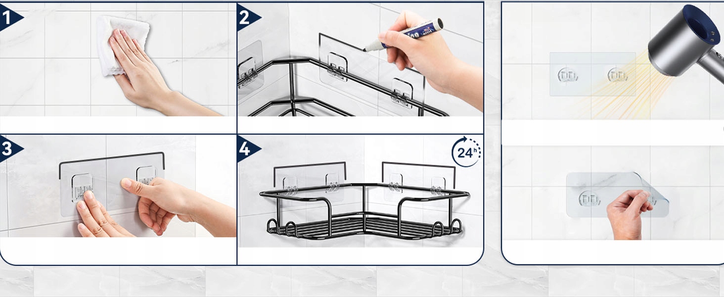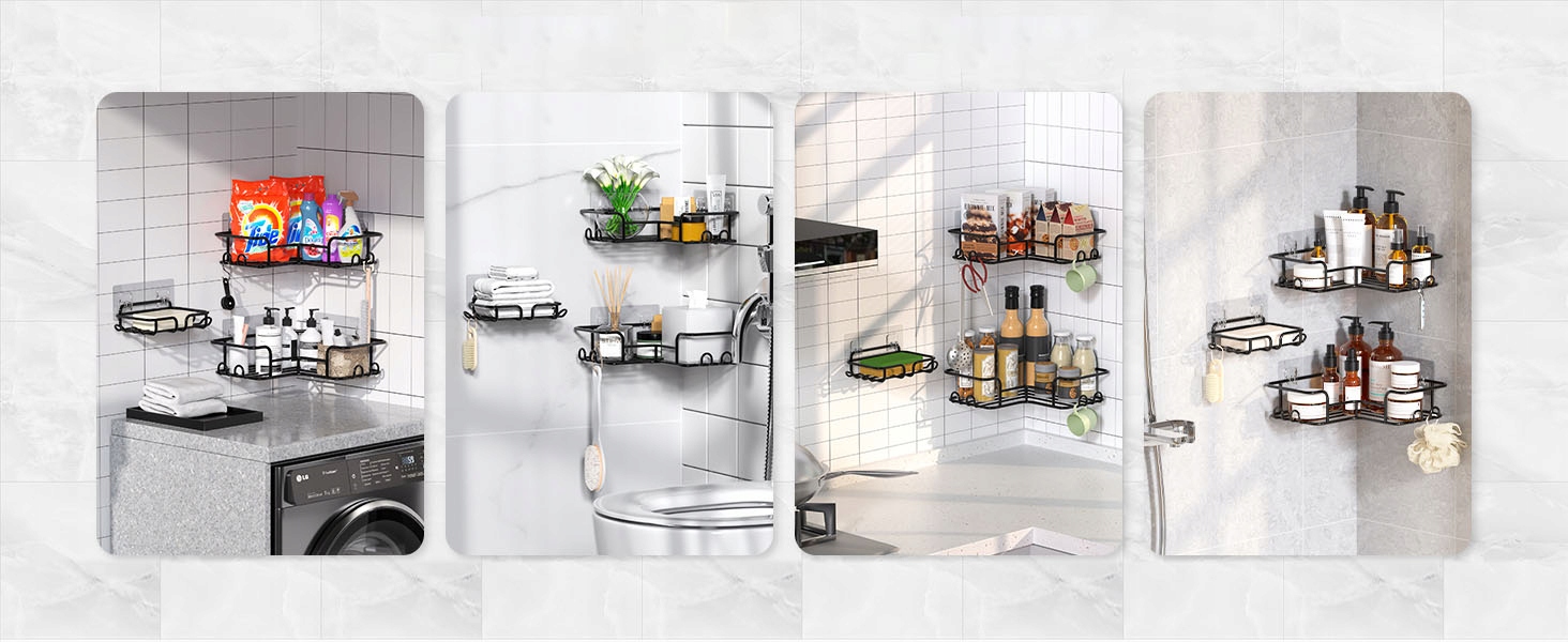 - Розроблена полиця для максимального використання кутових просторів. Він витримує до 18 кг, тобто вага 19 пляшок шампуню/гелю по 1 літр кожен. подряпини. Додаткові гачки, які додають додатковий простір для зручного зберігання інших предметів.