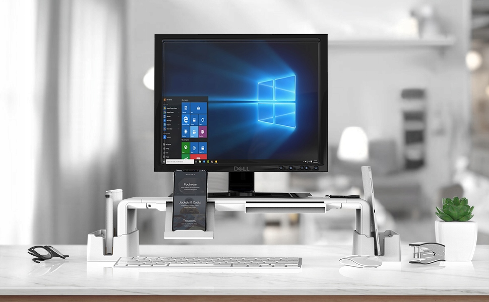 - 【Вбудований тримач і ящик для мобільного телефону】. Підставка для монітора постачається з тримачем для телефону, висувним ящиком для зберігання ручок, скріпок і блокнотів, а також тримачем для планшета. Таким чином ви не пропустите повідомлення чи дзвінки під час роботи, і ваш стіл буде чистим і охайним.