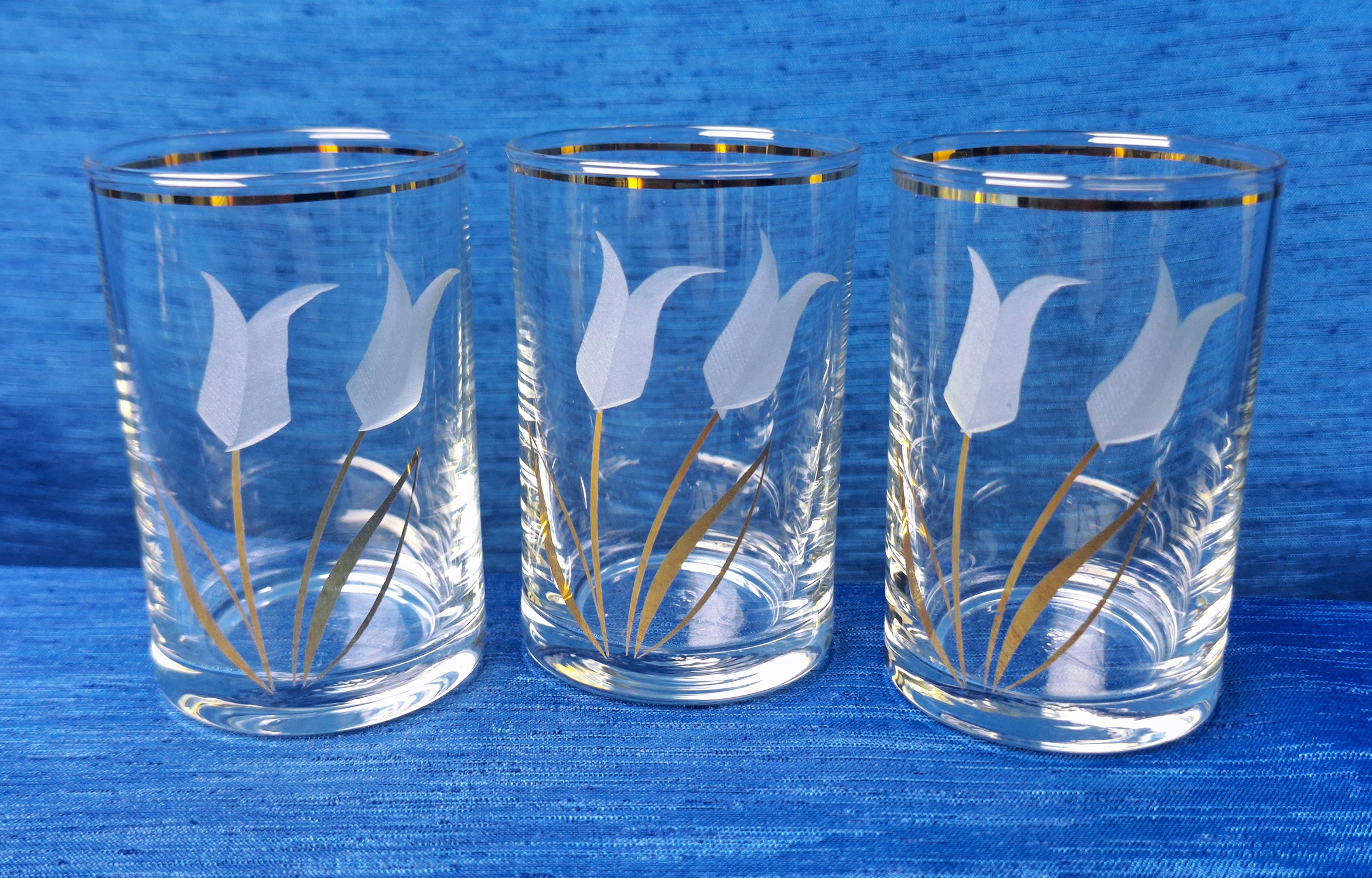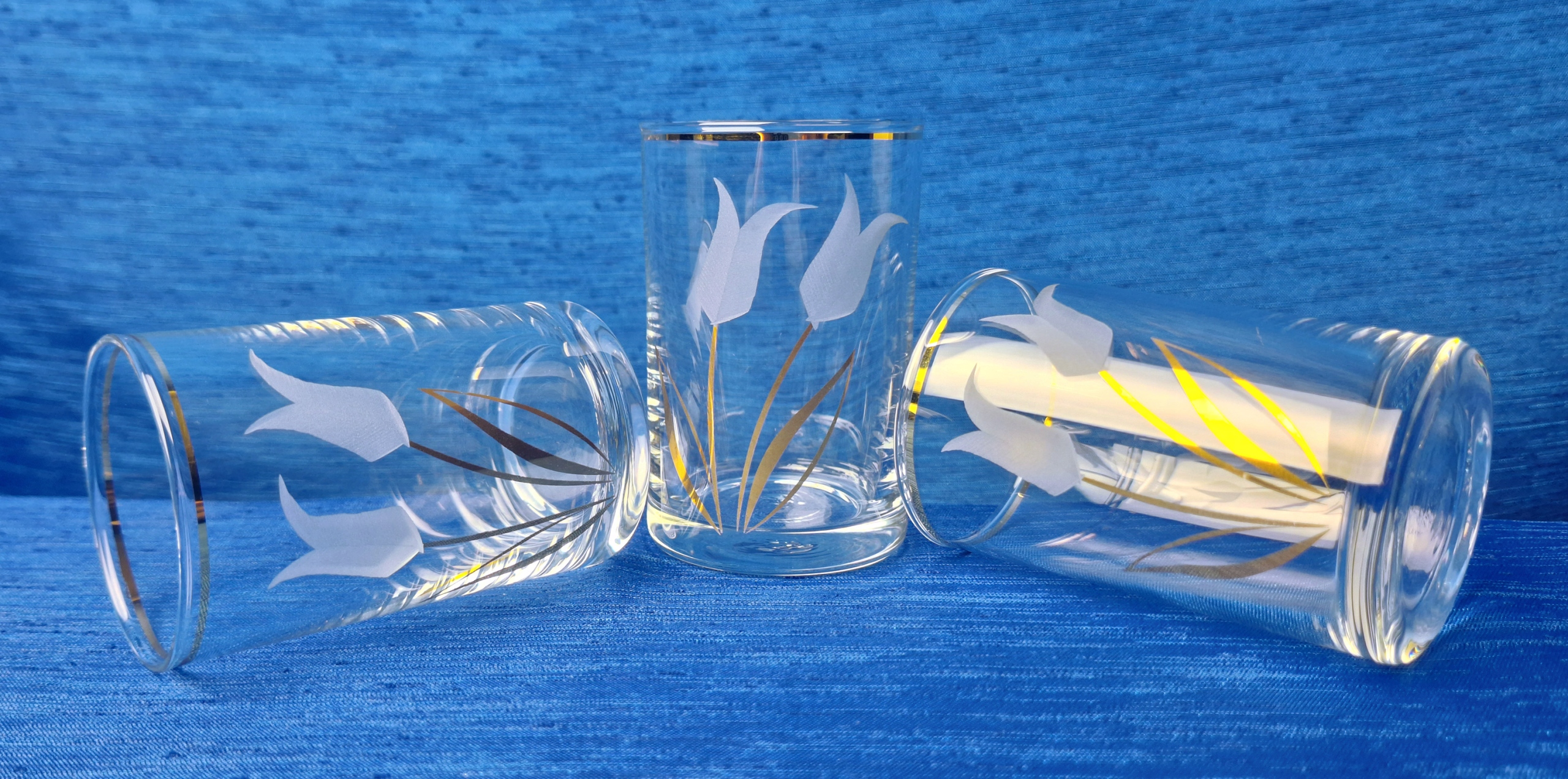 Скло прикрашене золотою смужкою у верхній частині та тюльпаном, що поєднує блиск золота та ручну матовість. У набір входить 6 склянок.