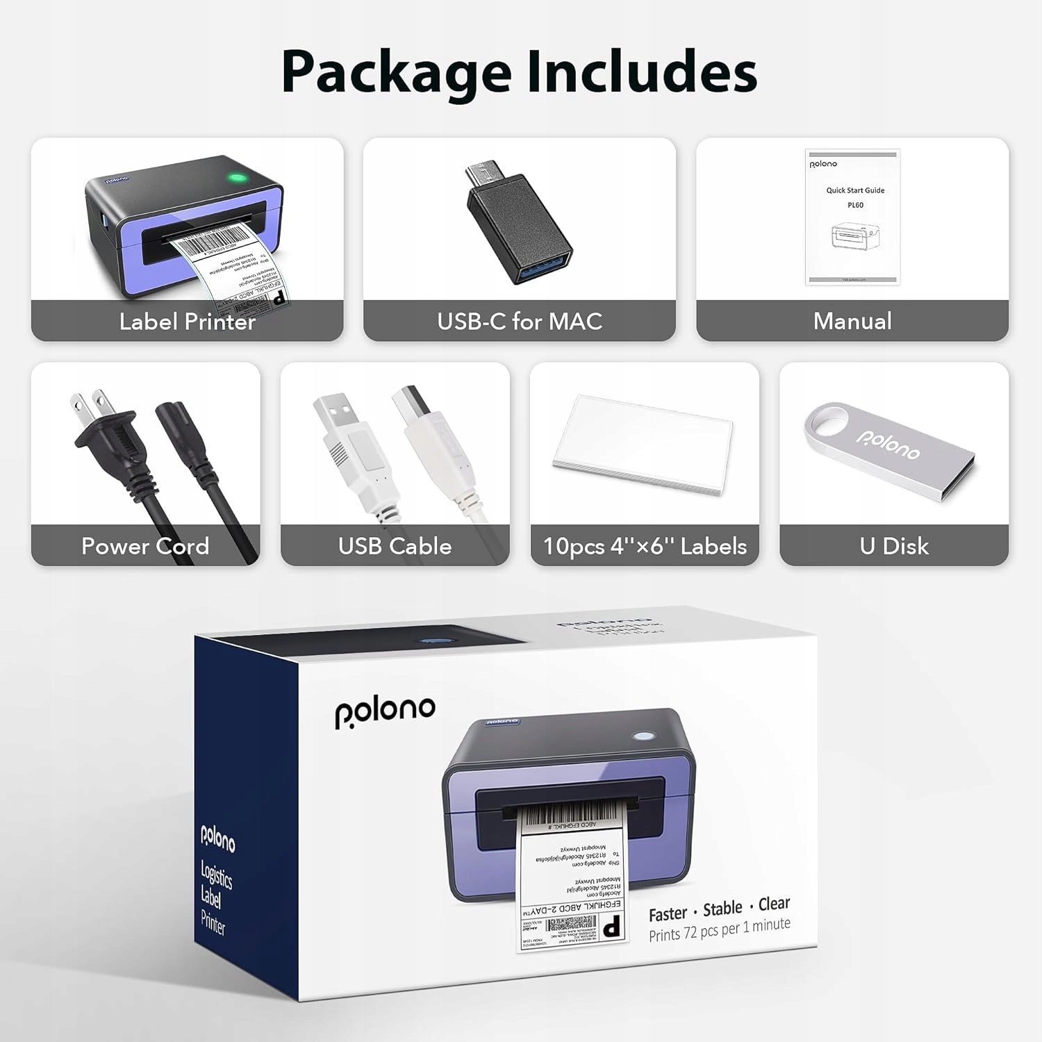 Принтер для доставки Polono, забезпечений 1 фіолетовим принтером, 1 паперовим зберіганням, 1 шнуром живлення, 1 USB, 1 дисковим, 1 знижками, 1 скороченим користувачем та дисковим дискоком, що містить контролер принтера, інструкції з інсталяції, інструкції з конфігурації та інструкції та інструкції.