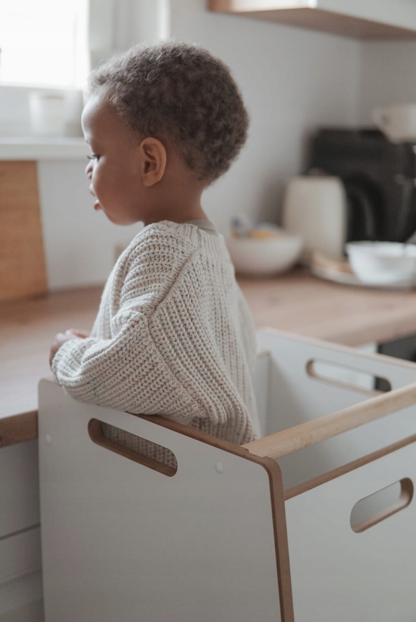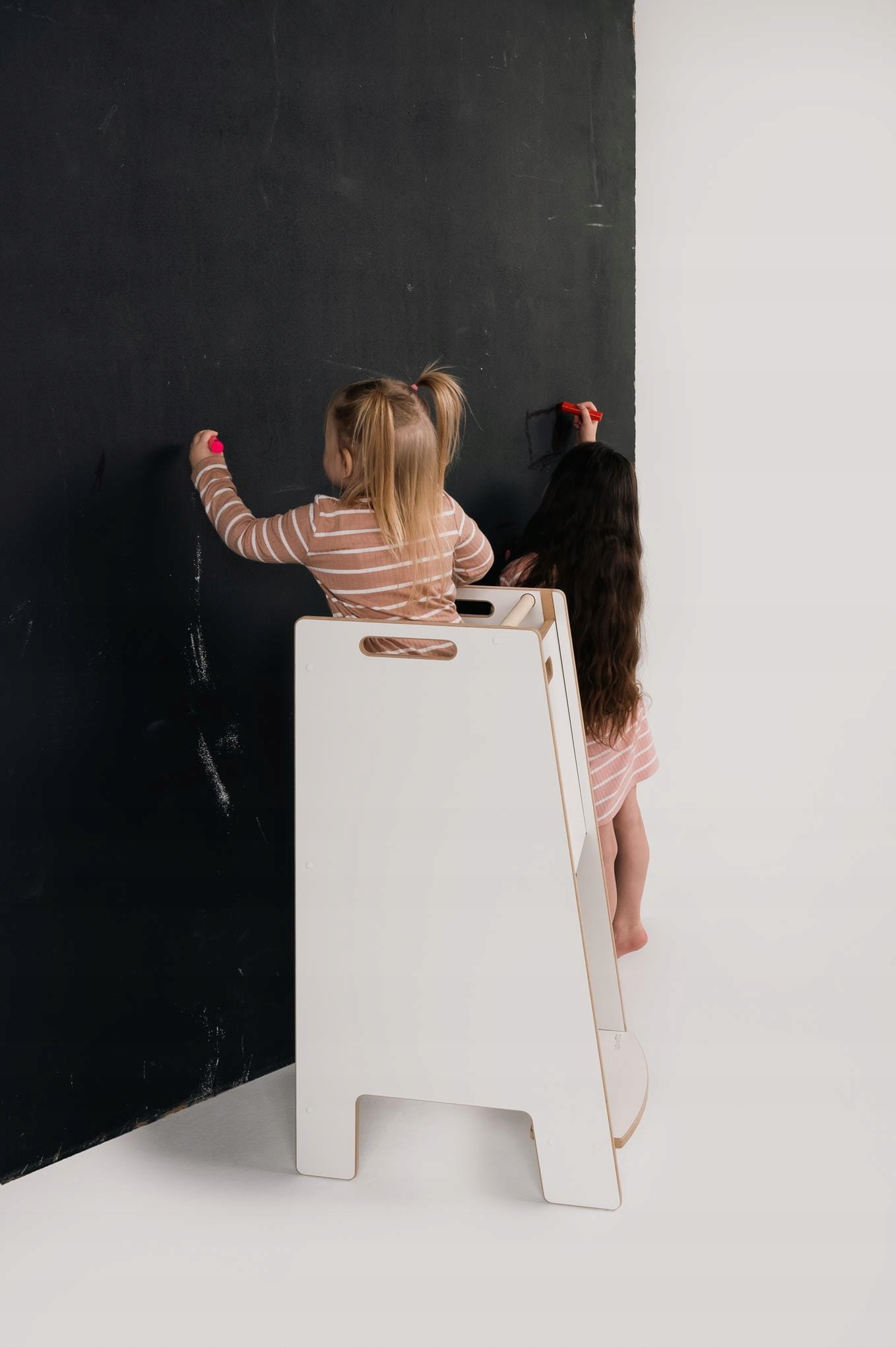 Помічник на кухні NOWAY, перш за все, БЕЗПЕЧНИЙ. Повністю вбудований з чотирьох сторін, з поперечиною ззаду і засувкою, яку можна висунути, щоб малюк міг самостійно піднятися на помічника - завдяки цьому, ми зменшуємо ризик падіння дитини на спину під час розваги. Завдяки 3-ступінчастому регулюванню платформи помічник росте разом з дитиною і прослужить йому дуже-дуже довго - висоту можна регулювати, не розбираючи його. В самому низу є сходинка, яка полегшує підйом. Помічник стійкий завдяки відповідній конструкції та вазі виробу.