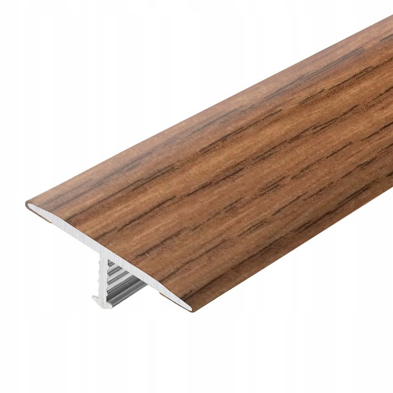 Т-подібний поріг "Т-брус" - ефективно і дуже непомітно з'єднує підлогу панелі, наприклад, у дверному отворі. Це так званий Т-подібний профіль – доступний у найпопулярніших кольорах підлоги. Водонепроникний, дуже міцний деревний шпон назавжди приклеєний до алюмінієвої смуги, створюючи настільки міцний виріб, що він буде виглядати як новий протягом багатьох років.