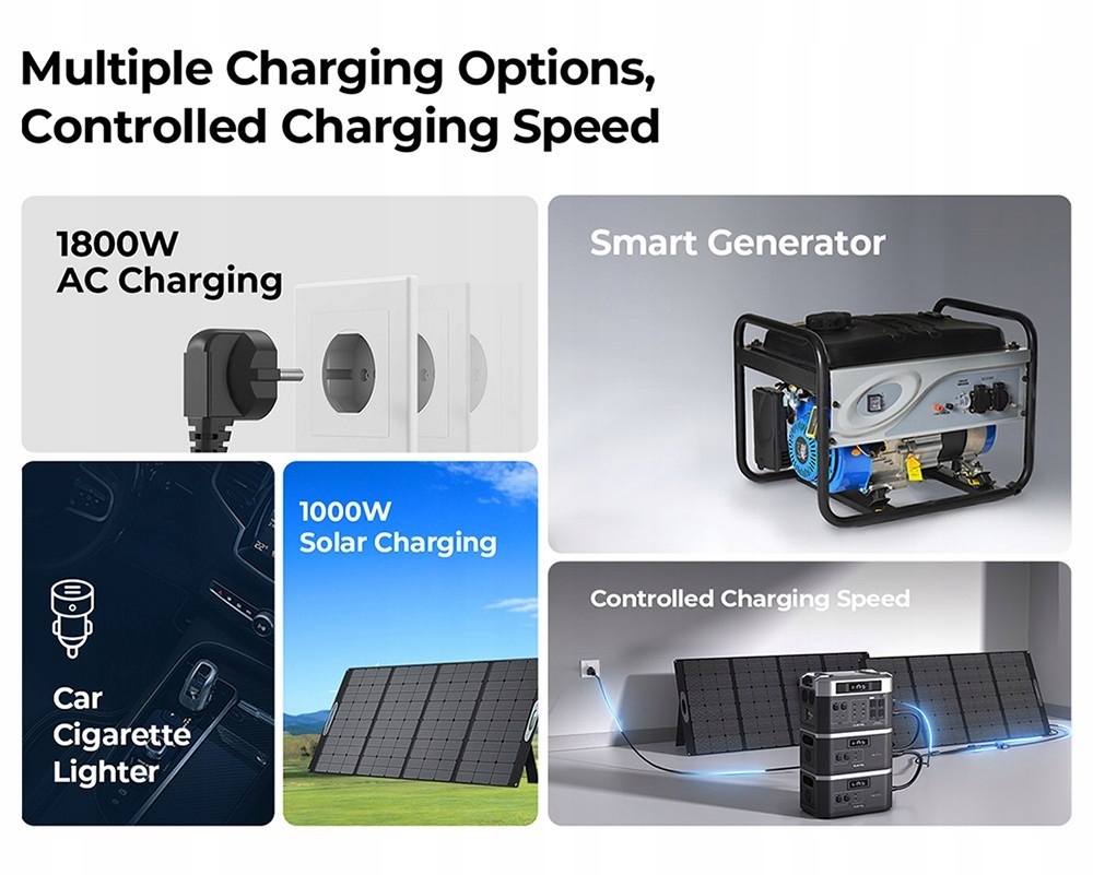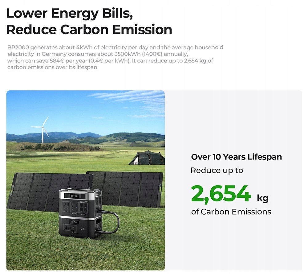 Портативна електростанція BP2000 оснащена сучасним двонаправленим інвертором, який забезпечує надшвидке заряджання від мережі змінним струмом із потужністю до 1800 Вт під час використання живлення від мережі. У ньому використовуються високоякісні захищені батареї LiFePO4 з 3500 циклами та інтелектуальна система BMS, що забезпечує безпечне та надійне енергопостачання. Він має систему живлення MPPT для живлення та може працювати як UPS під час відключення електроенергії. Він також може бути оснащений додатковою батареєю, яка може відповідати за споживання енергії.