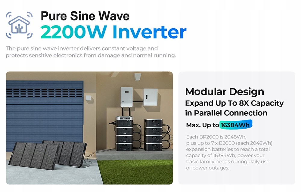 - Кожна батарея BP2000 має ємність 2048 Вт·год, і 7 розширювальних батарей B2000 (кожна ємністю 2048 Вт·год) можна підключити для забезпечення загальної ємності 16384 Вт·год, живлення від мережі живлення під час звичайного використання або відключення електроенергії.