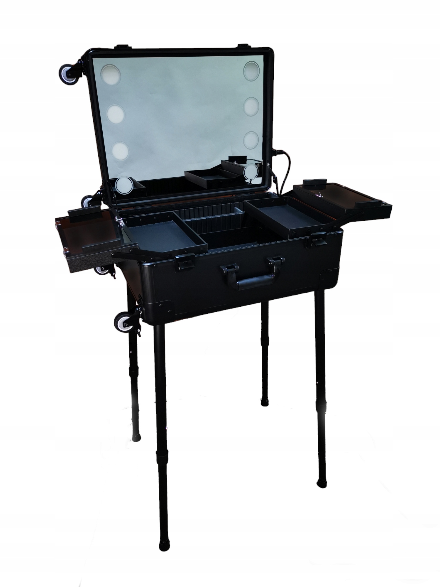 Станція для макіяжу, призначена як для професійних візажистів, так і для домашнього використання. У наборі є вбудоване дзеркало, яке підсвічується 8 світлодіодними точками, що імітують лампочки, і складані полиці, які також служать основою. Висувна ручка полегшує переміщення валізи. Висоту валізи можна регулювати.