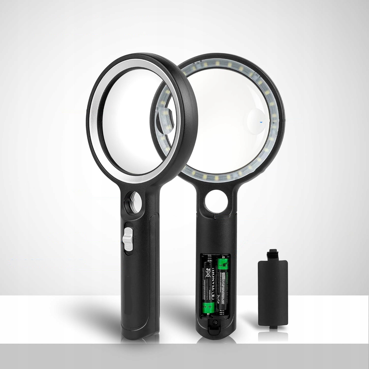 Цей великий лупа з підсвічуванням забезпечує 10-кратне збільшення. Крім того, він оснащений 1-дюймовою діафрагмою, що забезпечує 20-кратне збільшення та ще одну 1-дюймову діафрагму на ручці, забезпечуючи 45-кратне збільшення. (ПРИМІТКА: Цей лупа використовує опуклий об'єктив, а зображення може бути вертикальним або перевернутим. Lupa 45x забезпечує вертикальне зображення, коли об’єкт становить ≤3 см відстані, а зображення повертається на 180 °, коли об’єкт знаходиться на відстані> 3 см.)