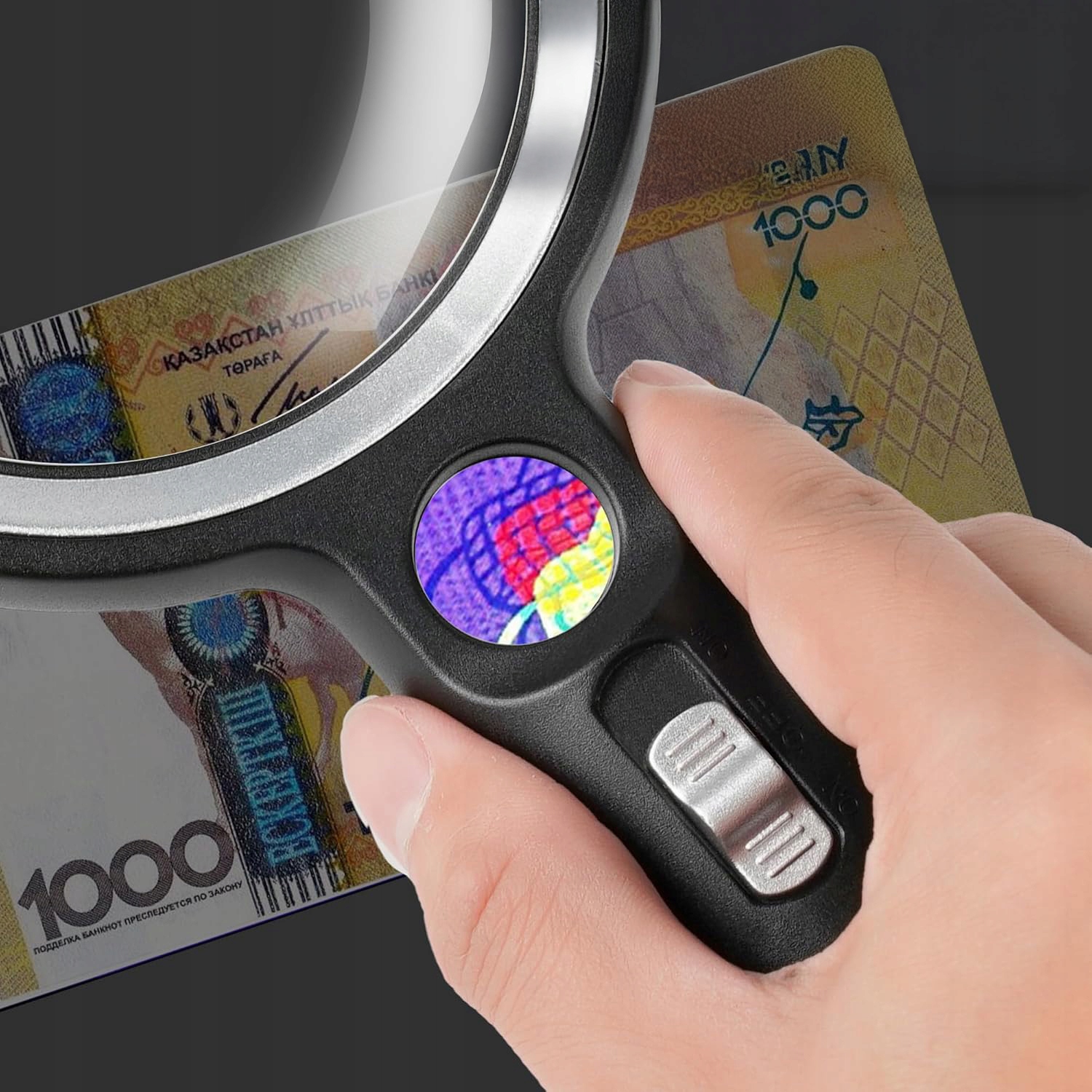 - ✔ побудовані -в 30 світлодіодів забезпечують додаткове освітлення в темному оточенні, а 1 УФ -лампа дозволяє визначити банкноти, паспорти, зображення та геологічні роботи. і працює від трьох акумуляторів AAA (не включені в набір).