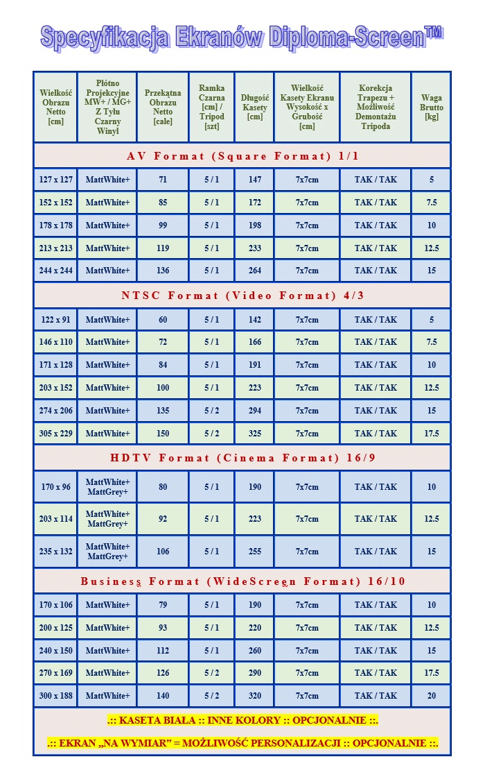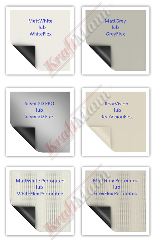 DiplomAscreen (Pro) ™ доступні "негайно" з 3- або 4-шаровим полотном для передньої конструкції Mattwhite+(Pro) / Mattgrey+(Pro) з шаром скасування склопластику на поверхні екрана та ззаду чорним, непроникним вініловим світлом