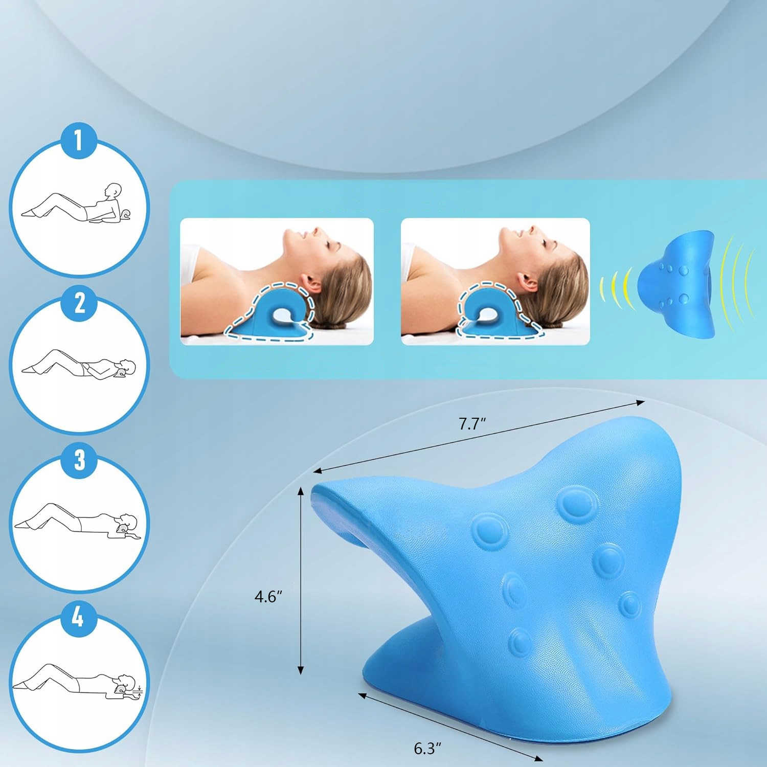 - простий у використанні. Просто ляжте на подушку шийки матки і нехай вага голови обережно простягає м’язи верхніх плечей і передню частину шиї. 4