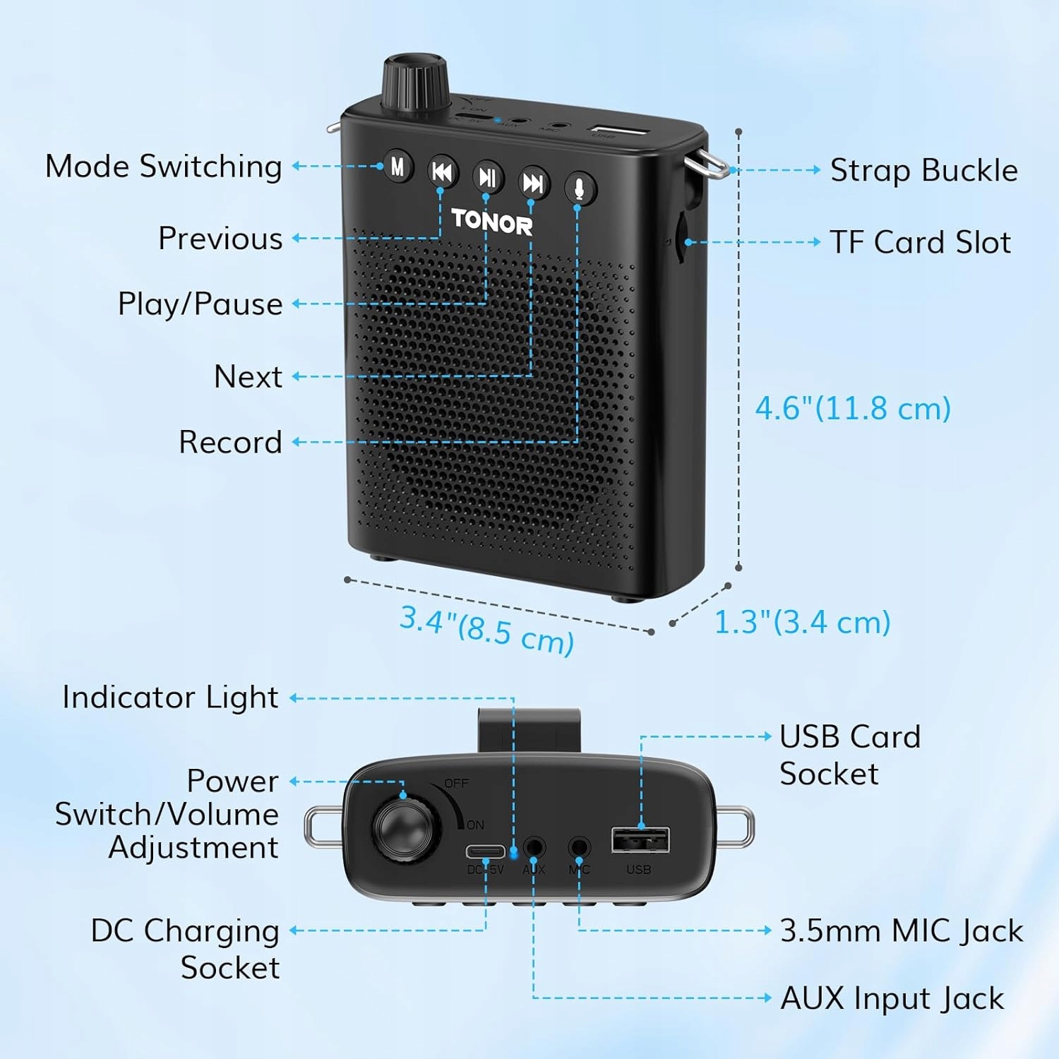 Універсальний динамік: Крім зміцнення голосу, цей голосовий підсилювач підтримує Bluetooth 5.2, AUX, TF -карту, USB -диск та запис одним дотиком, слугуючи аудіоплеєром. Він має високу чутливу FM -антену для стабільного радіоприймача та вбудованої пам'яті до 240 секунд запису без картки. Покращений Bluetooth 5.2 пропонує швидші, стабільніші з'єднання та всебічний контроль музики, сумісні з різними пристроями, включаючи телефони, iPad, планшети та ПК.