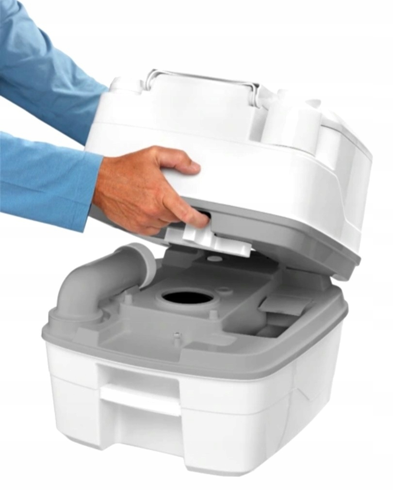 - 2 частини - у верхній частині є вбудований резервуар для води з туалетною чашою, а також відміченим сидінням та покриттям (повна труде). Нижня частина - це резервуар з домішок - калі. Нижній резервуар оснащений інтегрованим носком, який полегшує спорожнення та ручку перенесення. Ці дві частини можна легко підключити та відключити за допомогою важеля на задній частині туалету.