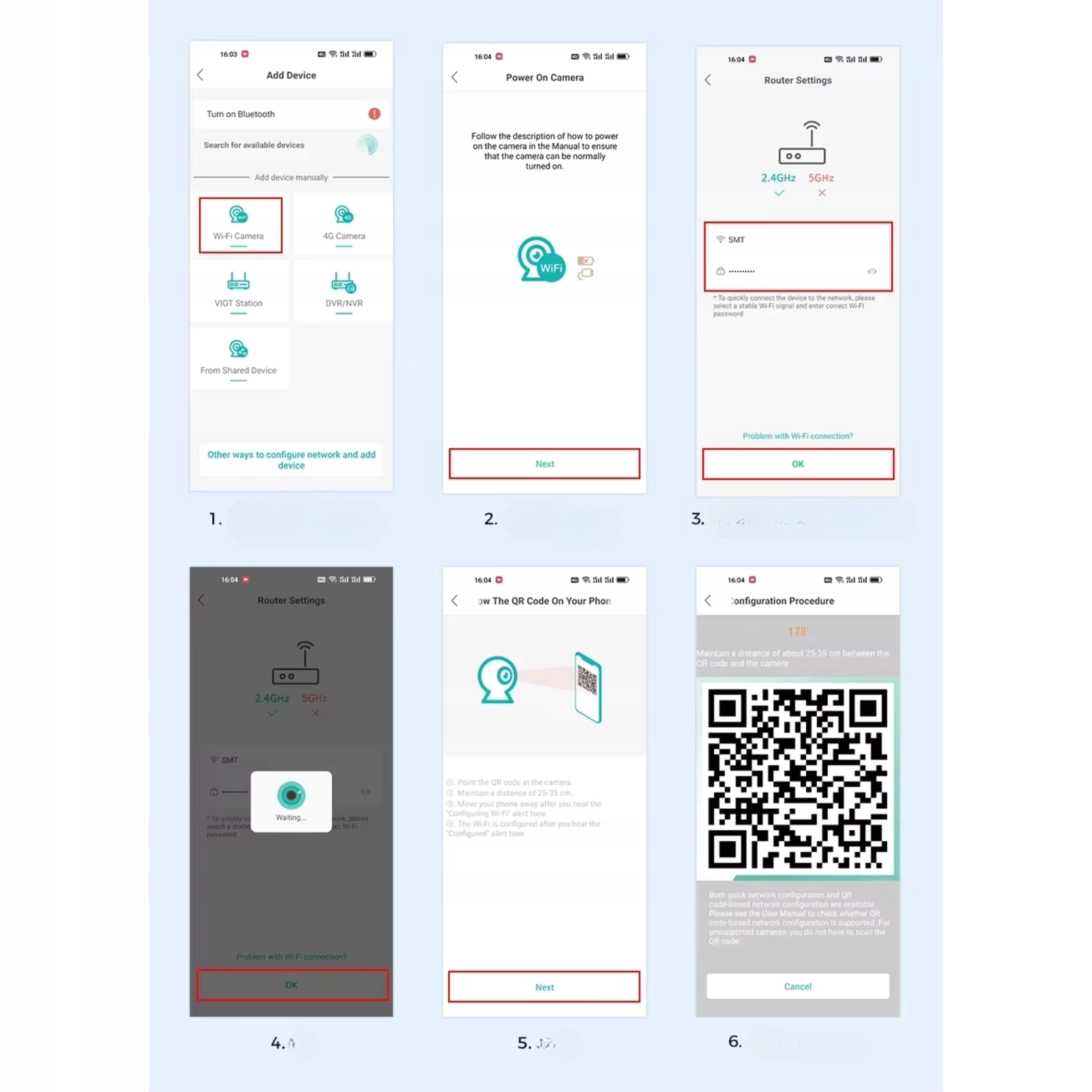 - Підключіть камеру через команду Wi -Fi 2,4 ГГц, зробіть на фотографії 6 кроків.