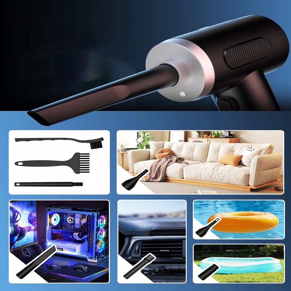 - Включає 5 насадок і 3 щітки . b>, що робить його універсальним інструментом для різноманітних застосувань, ідеальним для очищення корпусів комп’ютерів, клавіатур, автомобілів, вентиляторів тощо, а також для накачування плавальних кілець, м’ячів для йоги, надувних матраців тощо.