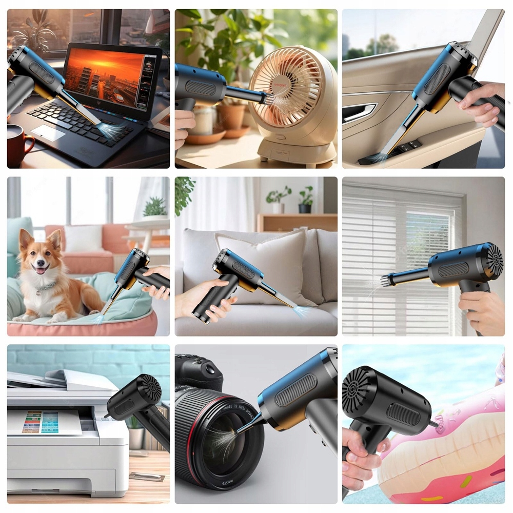 ⏩️⏩️【Комплексний набір для чищення】Наш портативний набір для чищення включає 5 насадок і 3 щітки, що робить його універсальним інструментом для різноманітних застосувань. Вузьке сопло легко дістається до кутів та інших важкодоступних місць, ідеально підходить для видалення пилу з корпусів комп'ютерів, клавіатур, автомобілів і вентиляторів. Багатофункціональне кріплення є вашим першим вибором для надувних поплавців, м’ячів для йоги, повітряних подушок тощо. Цей набір задовольнить усі ваші потреби щодо чищення та надування.