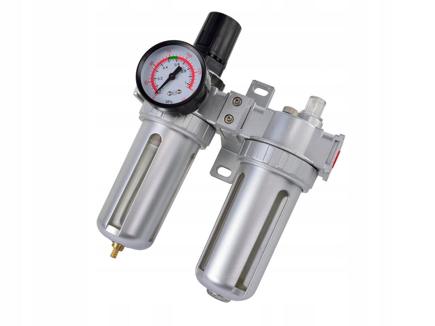 Редуктор 2-елементний з повітряним фільтром і мастилом. Редуктор з фільтром використовується, зокрема, для підтримки постійного робочого тиску, необхідного для правильної роботи. фарбувальних пістолетів, ударних гайковертів, шліфувальних машин і т. д. Крім того, пристрій фільтрує, зневоднює, видаляє масло і відокремлює всі забруднення. Ідеально підходить для інструментів, які потребують змащення.
