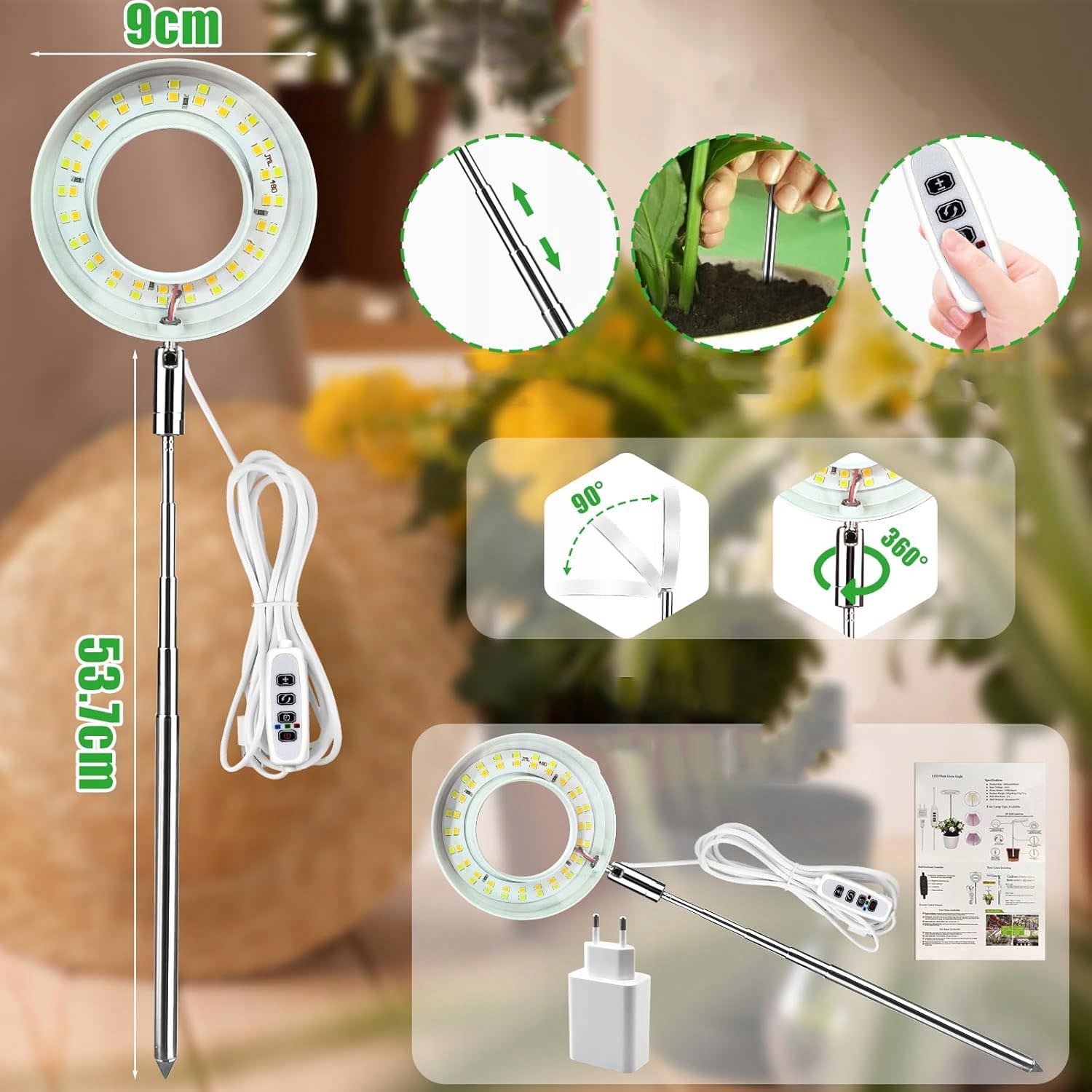 Ця світлодіодна лампа для рослин використовує високоефективне джерело світла з кольоровою температурою: 3000-6000 K та світла 50-70 л. Він містить 48 світлодіодних кульок: 24 білі + 24 теплі кольори, білий, теплий білий, три кольори можна регулювати за потребою, 360 ° освітлення, велике світло у формі кільця, яке може забезпечити рослини сильною і навіть інтенсивністю світла, щоб ефективно сприяти росту рослин. Номери мають функцію циклів часу 3/9/12. Ви можете встановити очікуваний час. Не потрібно вручну вмикати або вимикати світло щодня. Увімкніть функцію таймера, щоб переконатися, що рослини можуть постійно поглинати енергію, що дуже важливо для здорового росту рослин. Він піклується про рослини, коли ви перебуваєте на роботі чи у відпустці, легко та комфортно!