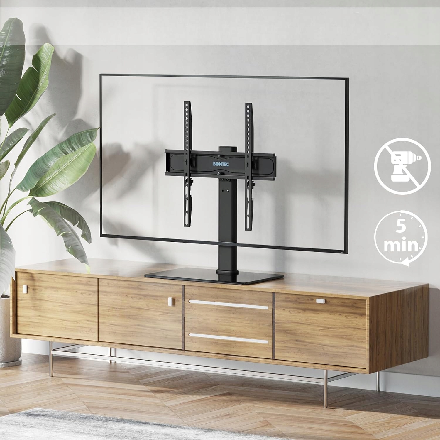 Підсумок: якщо ви шукаєте сучасне та функціональне рішення для свого телевізора, поворотна підставка для телевізора BONTEC — ідеальний вибір. Завдяки повороту на 50 градусів і регулюванню висоти ви можете налаштувати кут огляду відповідно до ваших індивідуальних потреб, забезпечуючи максимальний комфорт перегляду. Міцна конструкція з високоякісної холоднокатаної сталі та загартованого скла гарантує стабільність і довговічність, а максимальна вантажопідйомність 45 кг робить підставку безпечною навіть для більших телевізорів.