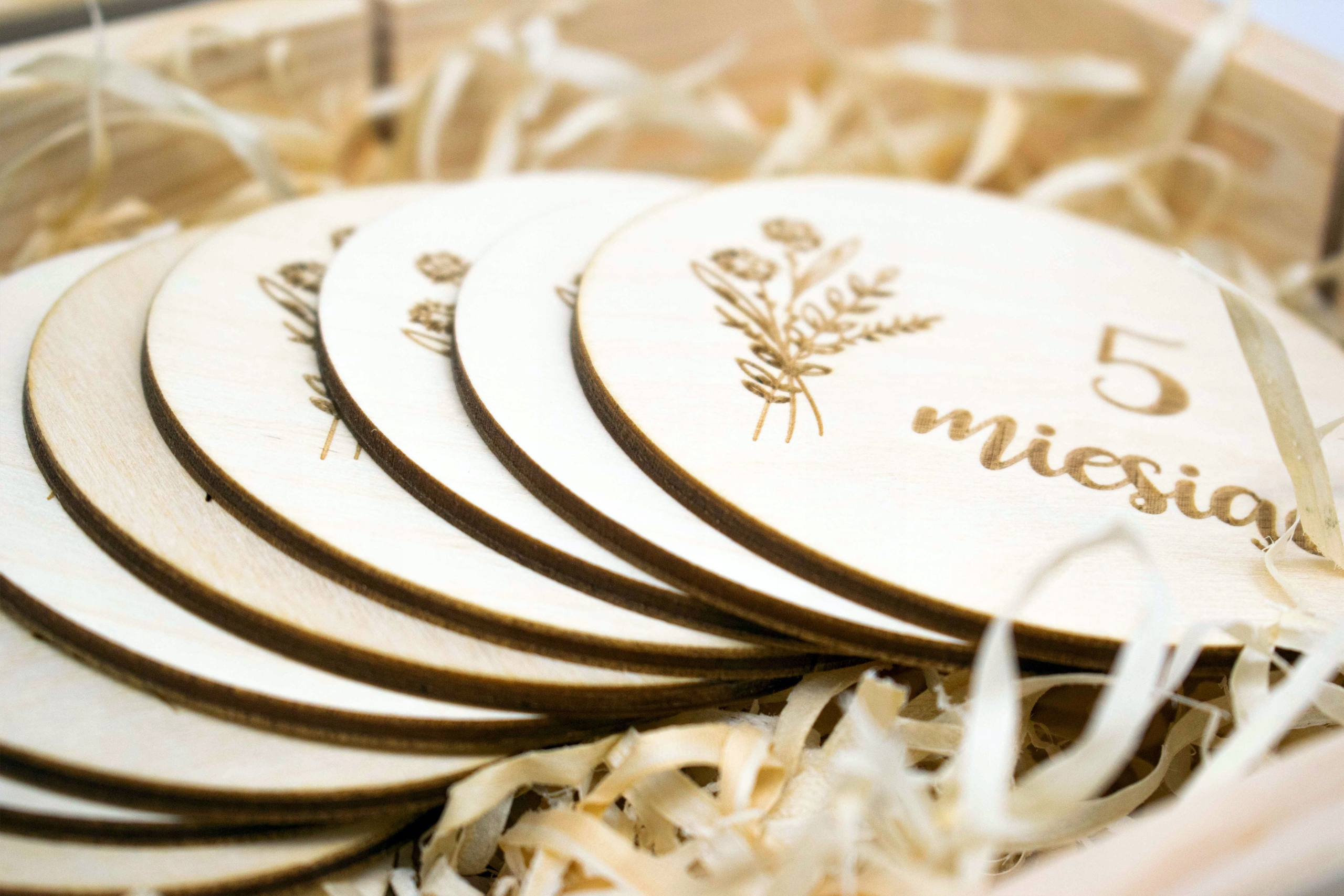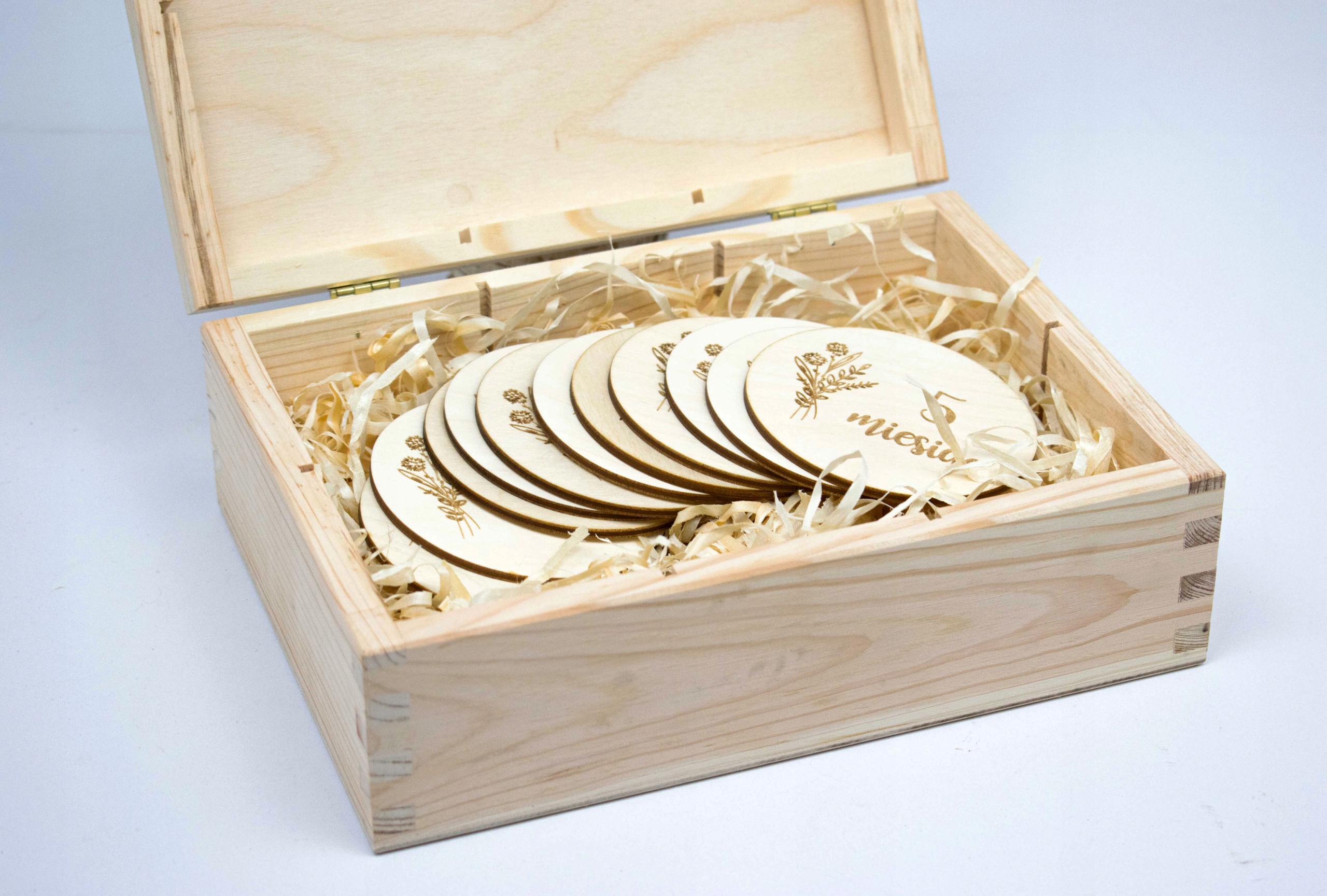 ✔️ 12 круглих таблиць із вигравіруваними місяцями, які дозволяють легко документувати розвиток вашої дитини. Завдяки їм майбутня мама зможе щомісяця робити фотографії свого малюка та складати їх у коробки із зазначенням числа та місяця. Це не тільки чудовий сувенір, а й чудовий спосіб стежити за розвитком і прогресом вашої дитини