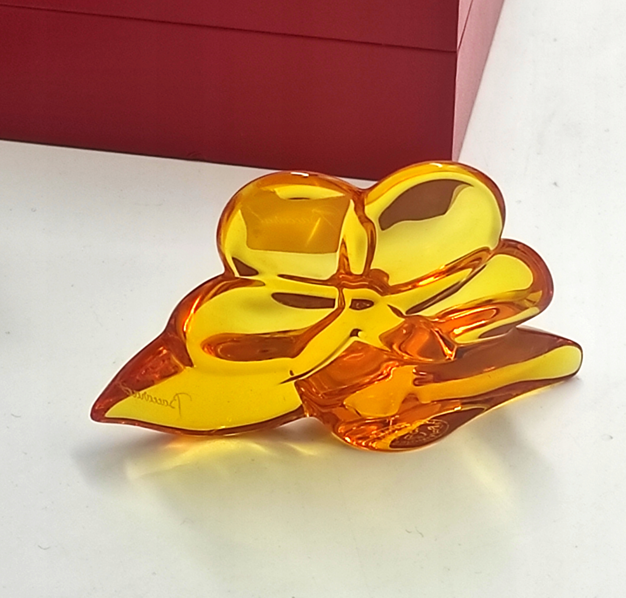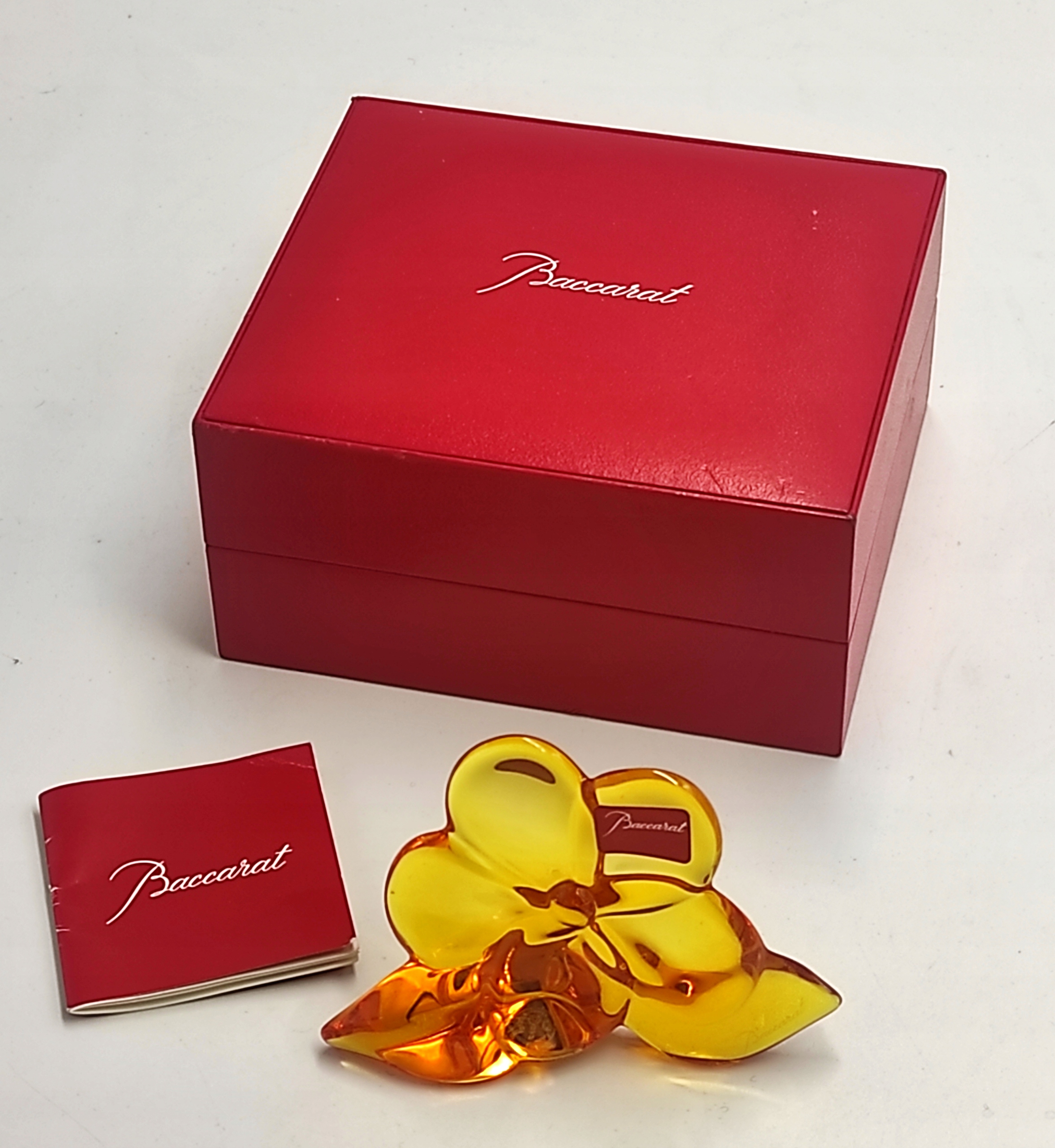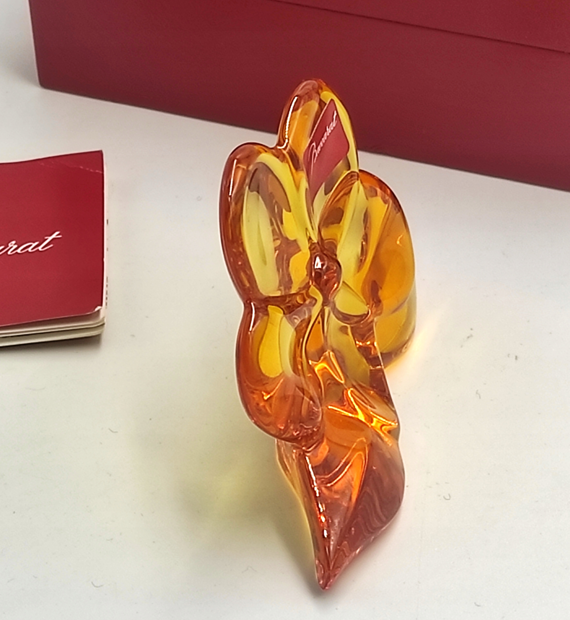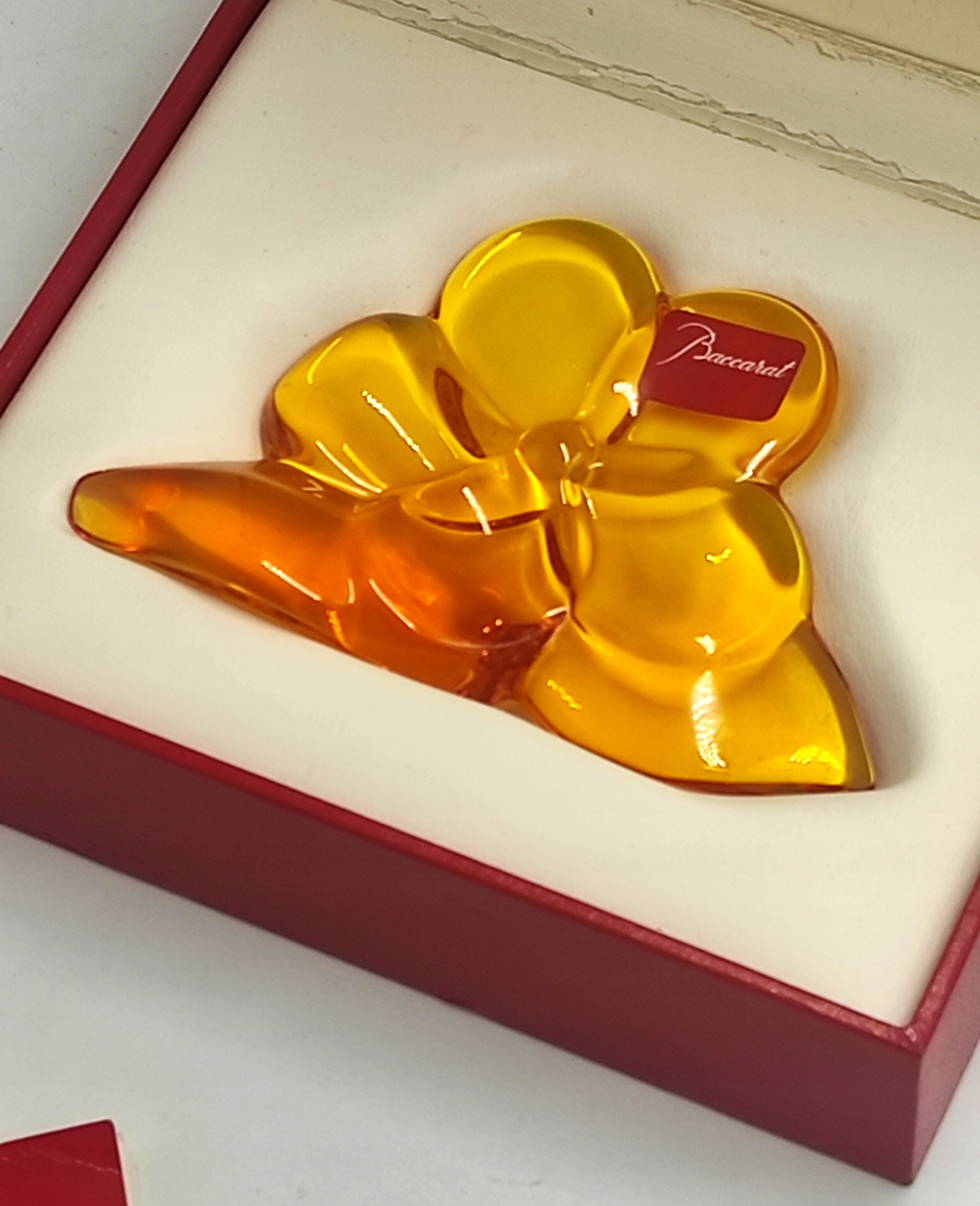 Звичайно, воно виготовлено з кришталю найвищої якості, який пропонує цей чудовий бренд. Має форму квітки дуже теплого, янтарно-медового кольору. Він все ще має оригінальну наклейку Baccarat, як видно на фото. Додатково підписаний на одному з аркушів. Упакований в дуже елегантний оригінальний футляр Baccarat характерного червоного кольору. Ідеально підходить як ексклюзивний подарунок, а також як елегантна прикраса для вікна.