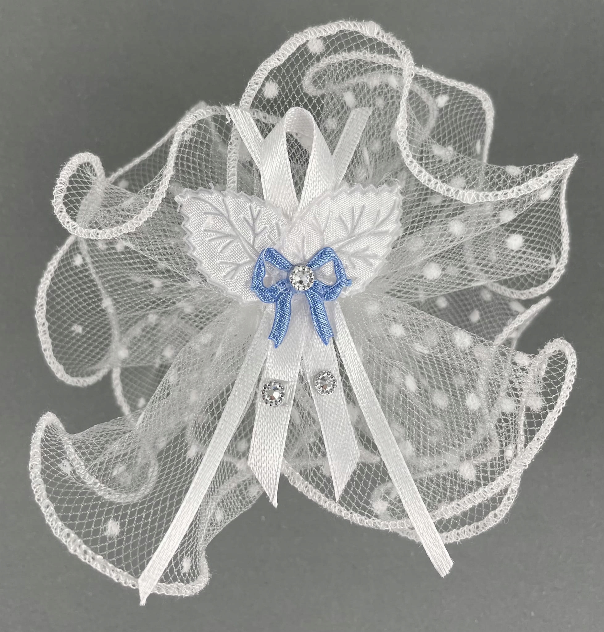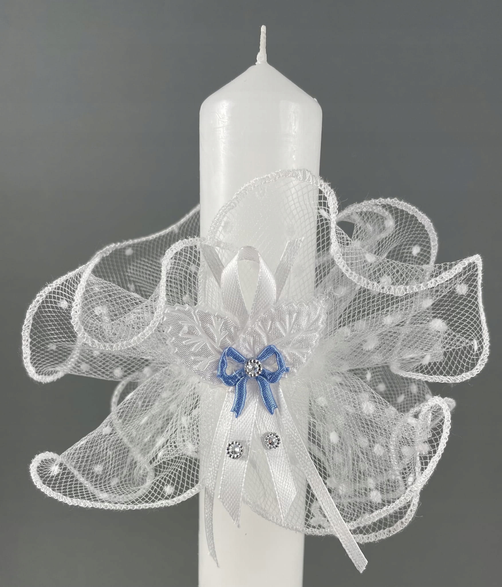 Білий, елегантний підсвічник з ніжними точками. Посередині прикраса з синім бантом і паєтками. Вся річ кріпиться на еластичну стрічку, що дозволяє індивідуально підігнати прикрасу під різні діаметри свічки.