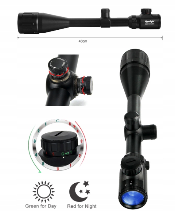 Надійний, гарне збільшення та регулювання фокусу. Відстань і збільшення точно націлюються на цілі. Блокуючу турель можна швидко підняти для швидкого регулювання. Фронтальний фокус. Підсвічування червоно-зелене, батарейка в комплекті.