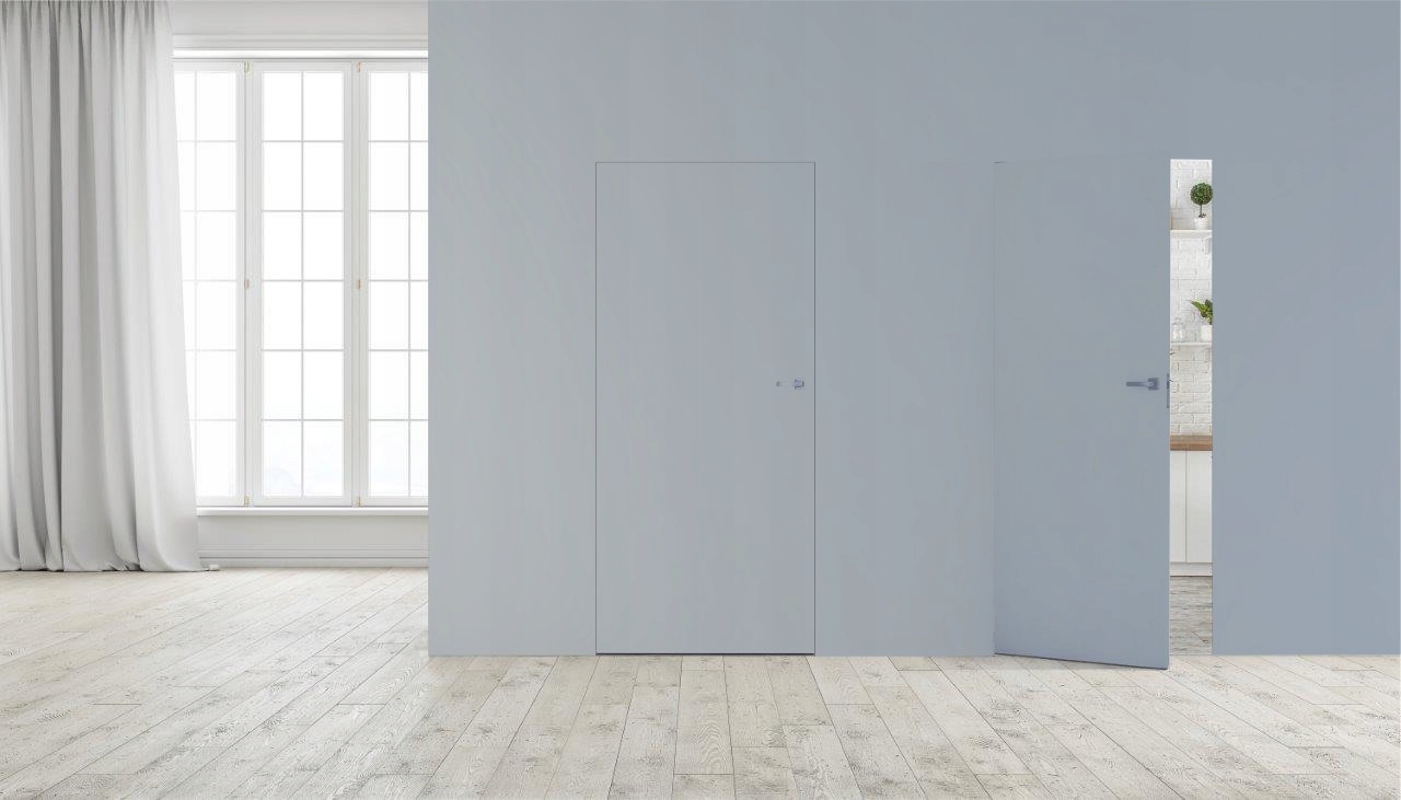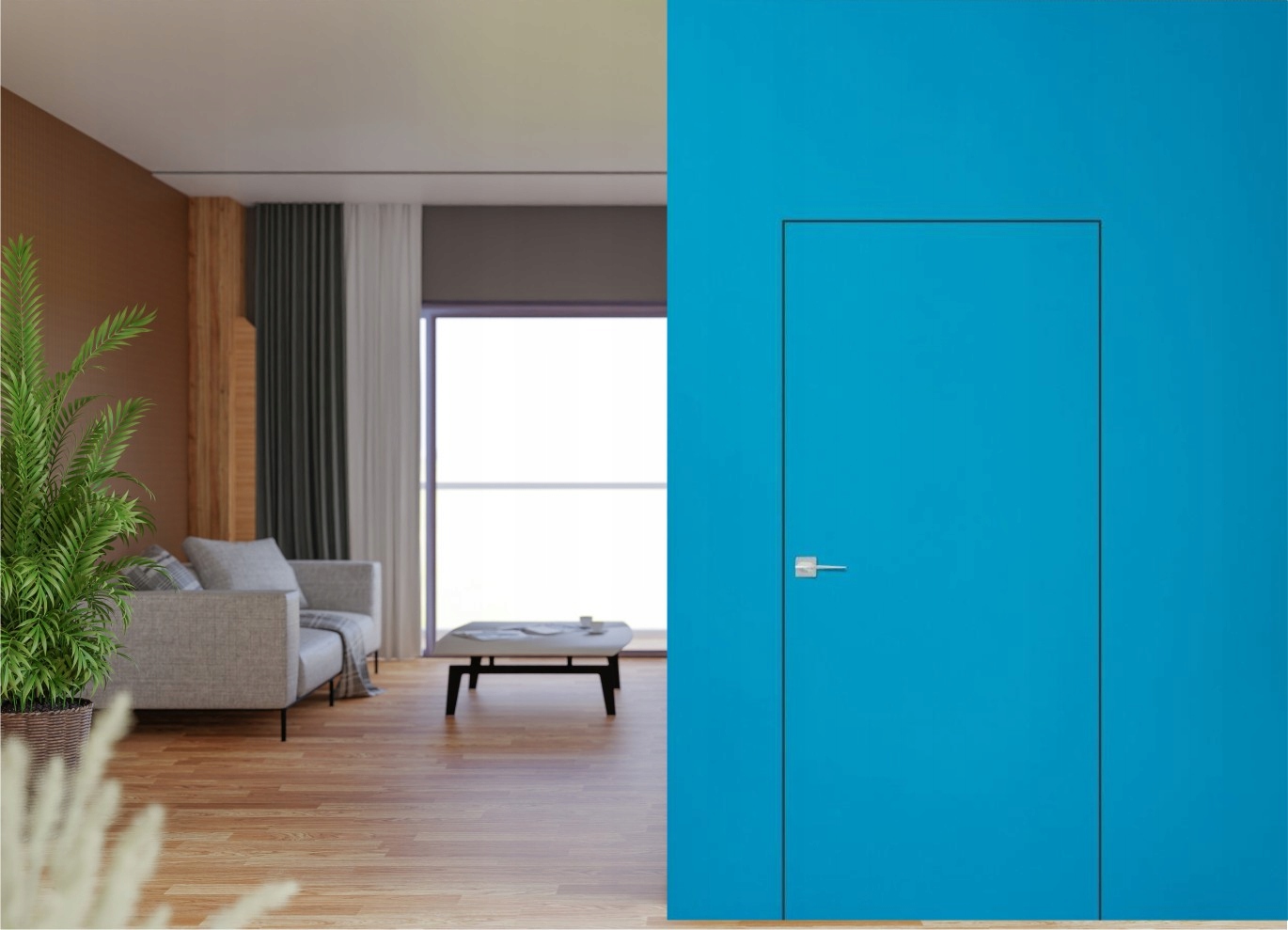. Двері, заховані в стіні (змиті стіною) наголошують на сучасному стилі інтер’єру, і можливість окремої обробки дозволяє візуально приховати крило на стіні, покриваючи їх тією ж фарбою або друком. Спеціальний тип прихованої будівельної рами в стіні робить його абсолютно невидимим після закінчення.