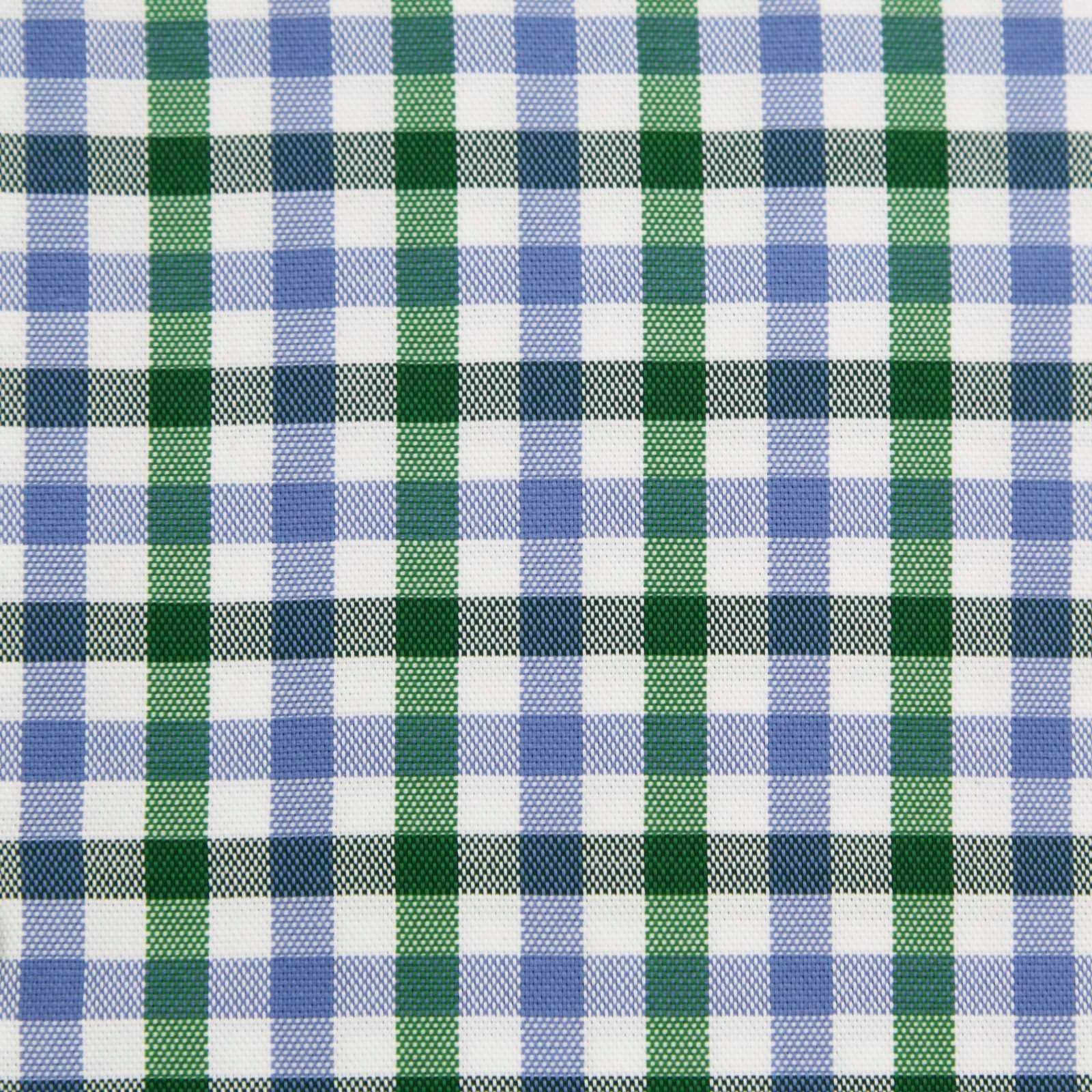 Сорочка з довгими рукавами з синьо-зеленим візерунком у клітку на білому тлі.