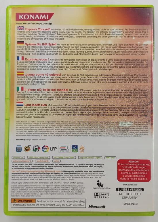 Оплачивая «Pro Evolution Soccer 6 Xbox 360», вы можете быть уверены, что данное изделие из каталога «Microsoft Xbox 360» будет доставлено из Польши и проверено на целостность. В цене товара, указанной на сайте, учтена доставка из Польши. Внимание!!! Товары для Евросоюза, согласно законодательству стран Евросоюза, могут отличаться упаковкой или наполнением.