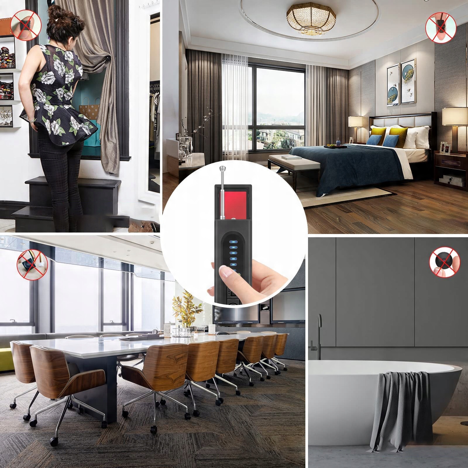 На відміну від інших продуктів на ринку, він не тільки розширює частоту пошуку, але й ефективно уникає порушених сигналів, які є всюдисущими в житті. Динамічне виявлення навколишніх активних РФ передавачів, таких як бездротові камери, бездротові монітори, пристрої відстеження GPS та інші. Відкрийте для себе приховані шпигунські камери завдяки лазерному скануванні. Використання магнітних полів для пошуку прихованих пристроїв моніторингу. Ліхтарик спереду для зручного використання в темному середовищі.