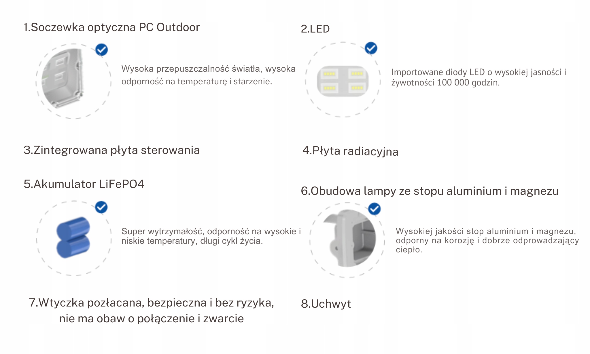 Наші сонячні лампи пропонують низку вдосконалених функцій, які відрізняють їх від стандартного світлодіодного освітлення. Перш за все, вони енергозберігаючі та розраховані на тривалу роботу без необхідності підключення до мережі, що дозволяє насолоджуватися незалежністю на відміну від традиційних джерел енергії. Ефективна батарея та інноваційний контролер MPPT (Maximum Power Point Tracking) гарантують максимальне використання сонячної енергії, оптимізуючи процес заряджання навіть за менш сприятливих погодних умов.