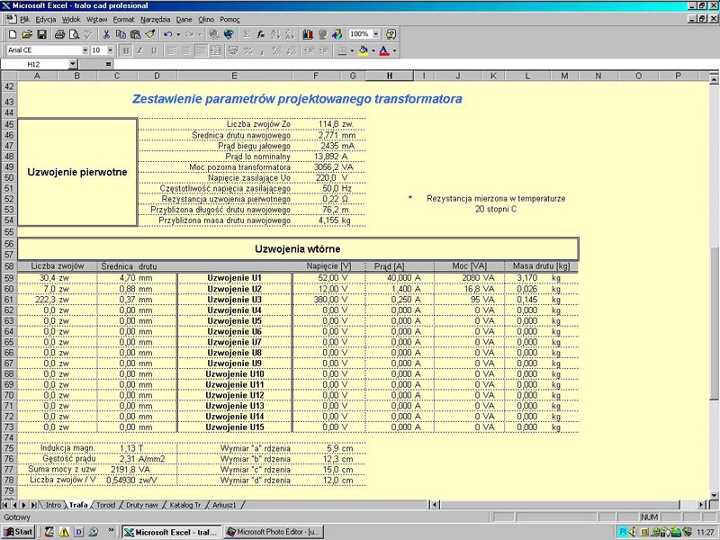 Професіонал TRAFO-CAD-це програма, що працює під контролем Excel 95 та вищою електронною таблицею. Це дозволяє розробити будь -які трансформатори (не лише мережа). Немає обмежень, коли мова йде про введені параметри. Напруга живлення (220 В), напруга потужності (50 Гц), індукція ядра (1,2T), щільність струму (2,5А/мм2) встановлюється як стандарт - але ці значення можна вільно змінювати на потребах. Проектування трансформатора зводиться до впровадження необхідних напруг та струмів, а також до введення розмірів ядра. Якщо необхідно, ви можете змінити решту параметрів, таких як напруга первинної сторони, індукція в ядрі і т. Д. Програма на постійній основі обчислює всі параметри та зазначає, чи придатне ваше ядро для даного проекту. Якщо так, це дає інші параметри трансформатора - кількість поворотів і діаметри обмоткових проводів для кожної обмотки (програма дозволяє проектувати трансформатори з максимальною кількістю вторинних обмоток, що дорівнює 15).