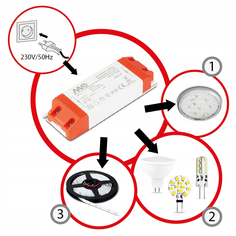 Блок живлення працює з освітлювальними пристроями, такими як: