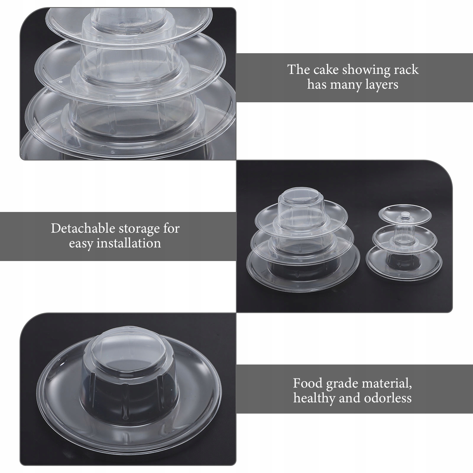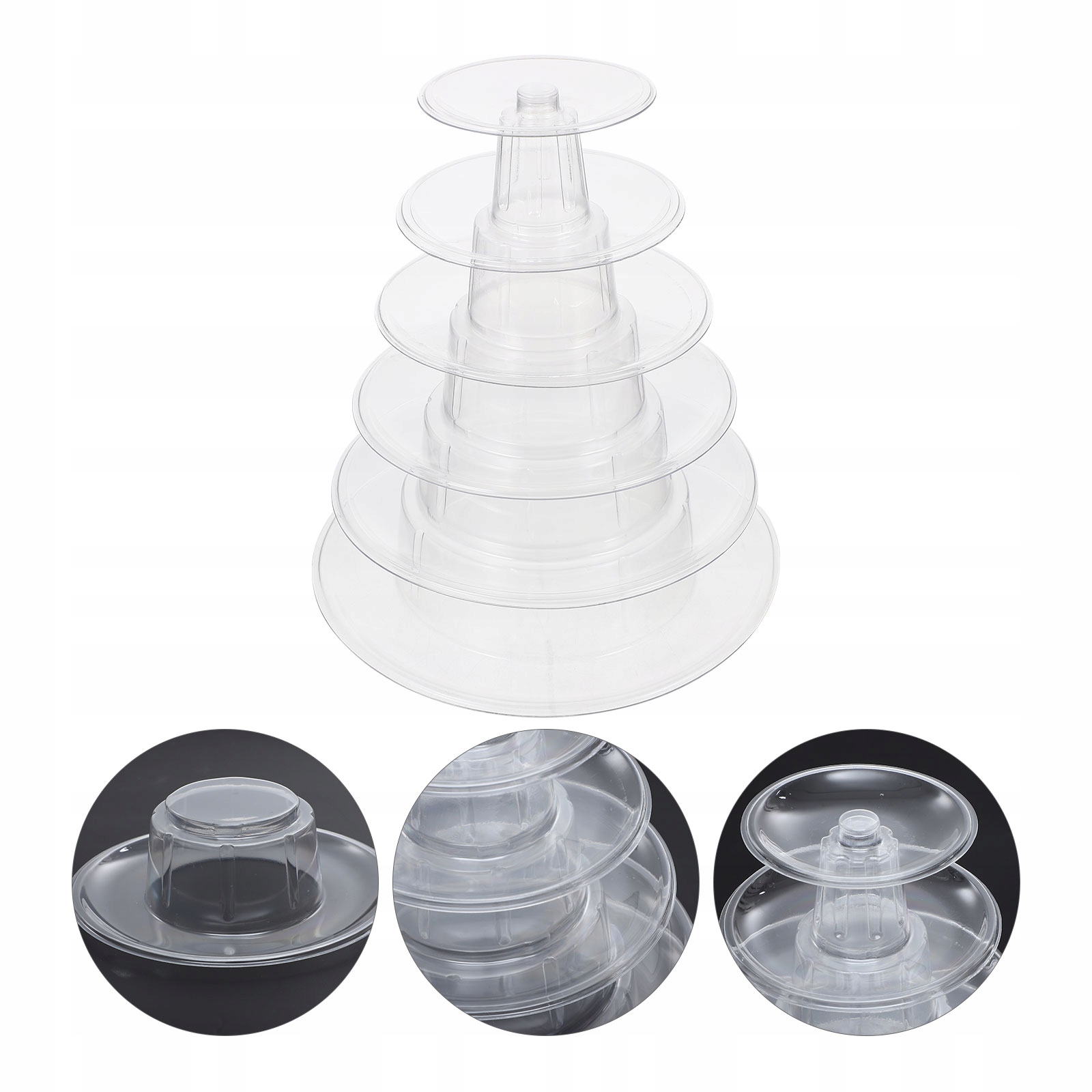 Цей продукт — підставка для макаронів із високоякісного та міцного пластику. Це ідеальна підставка для торта для вашого дому. Він може містити закуски, торти, фрукти, морозиво та інші справжні предмети тощо. Найкращий вибір для вас.