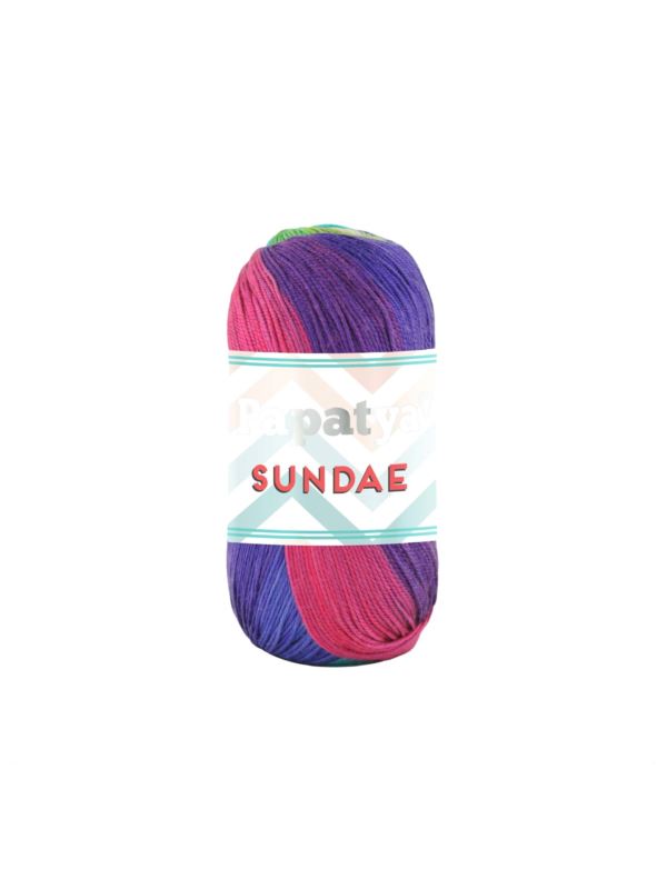 Papatya Sundae виготовлена з легкої пряжі мікрофібри. Кольори пряжі були ретельно підібрані для створення приголомшливих і елегантних різнокольорових поєднань. Цю пряжу особливо рекомендують для в’язання літніх виробів та аксесуарів гачком.