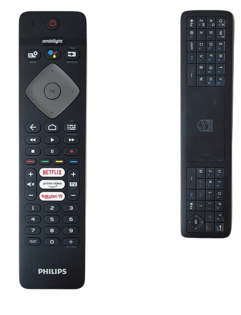 оригінальний пілот Philips 398g10bephn0042ht (видно на фотографії), присвячений вибраному Philips Smart TV з років (2019-2023) з функцією Netflix Ambilight та додатково обладнаним клавіатурою Qwerty -підходить до Philips TV, який спочатку був обладнаний чорним кольором (