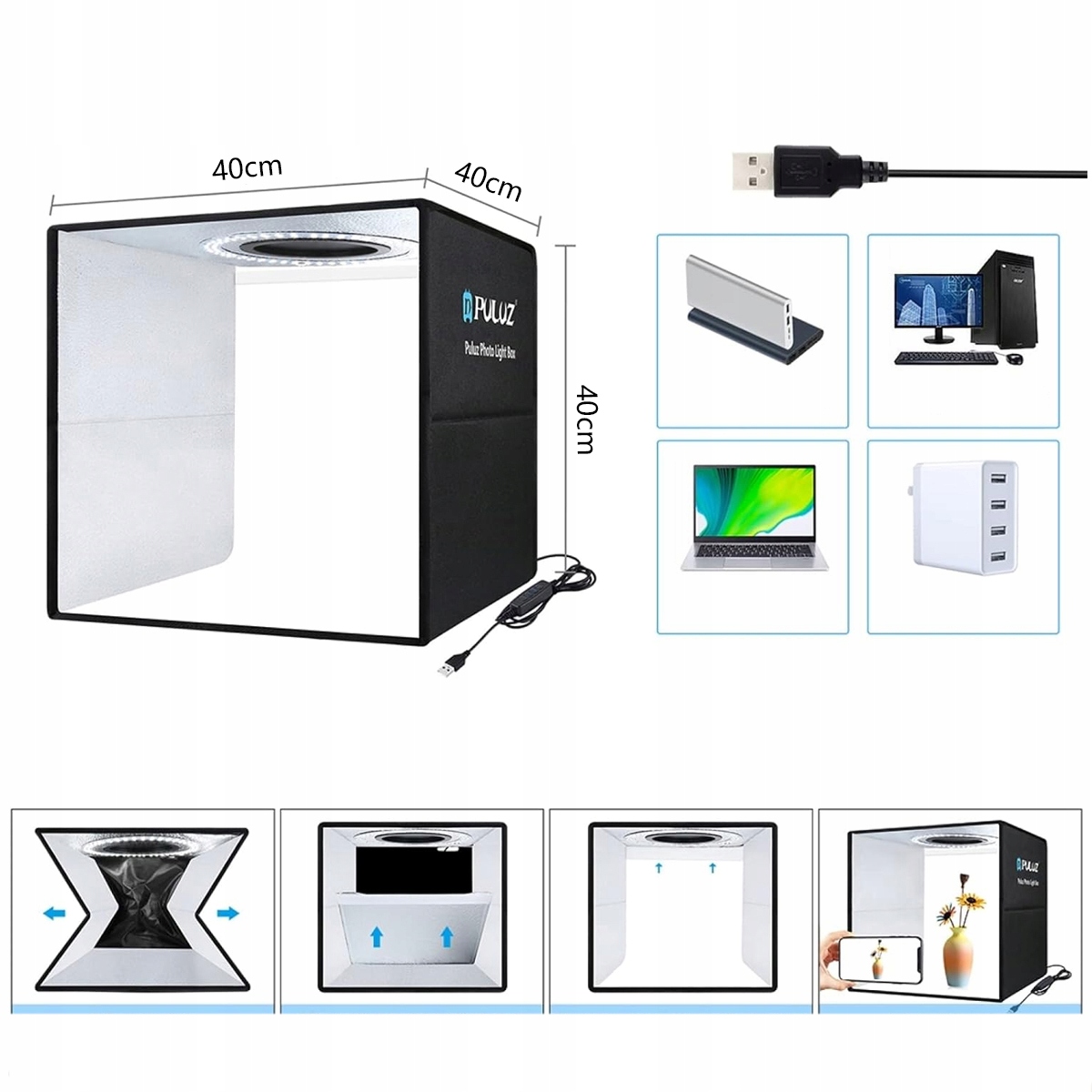 Виріб оснащено USB-кабелем, який дозволяє живити його від мережі 5 В. Ви можете легко підключити намет не лише до звичайного мережевого зарядного пристрою, а й до павербанк або навіть комп’ютер чи ноутбук. Це дає вам більше свободи під час фотографування - вам більше не потрібно обмежуватися доступними розетками. Пристрій також забезпечує безпечне використання.