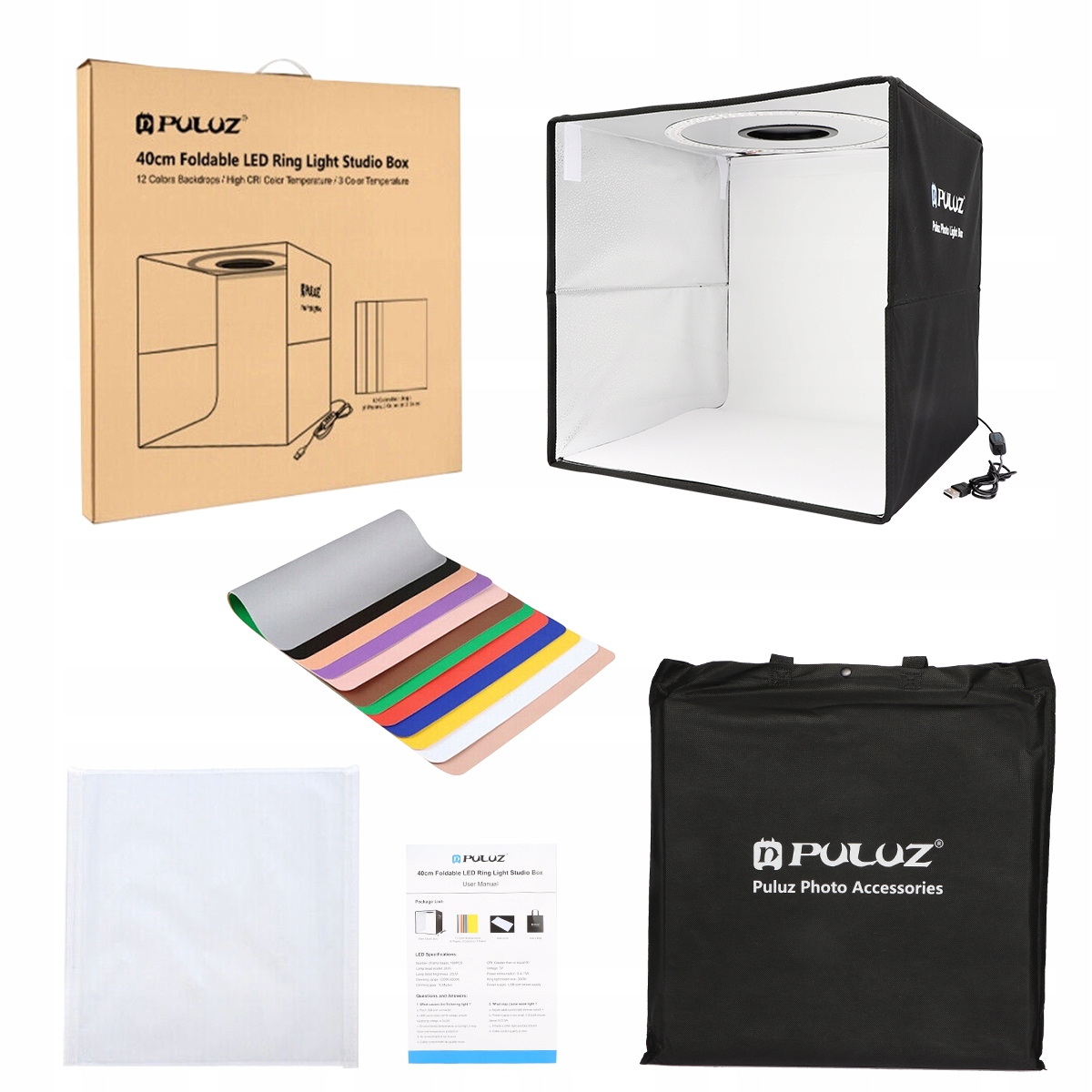 Безтіньовий намет Puluz PU5041B ідеально підходить для фотографування продуктів тощо. За допомогою нього ви можете правильно відобразити вибрані предмети, такі як прикраси, іграшки, гаджети чи аксесуари. Продукт також забезпечує відмінну якість світлодіодного освітлення. Він пропонує 3 режими освітлення та 10 рівнів яскравості на вибір. Він оснащений кабелем USB, який дозволяє його живити. У набір також входять змінні двосторонні фони (6 штук) 12 кольорів.