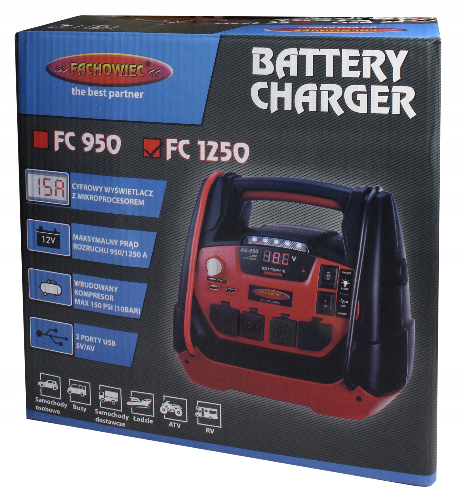 Багатофункціональний переносний пусковий пристрій з компресором FC-1250 призначений для аварійного запуску двигунів внутрішнього згоряння з установками 12В. Пристрій можна використовувати лише для обслуговування свинцево-кислотних акумуляторів (WET). Його не можна використовувати для акумуляторів, які не призначені для підзарядки або остаточно пошкоджені.