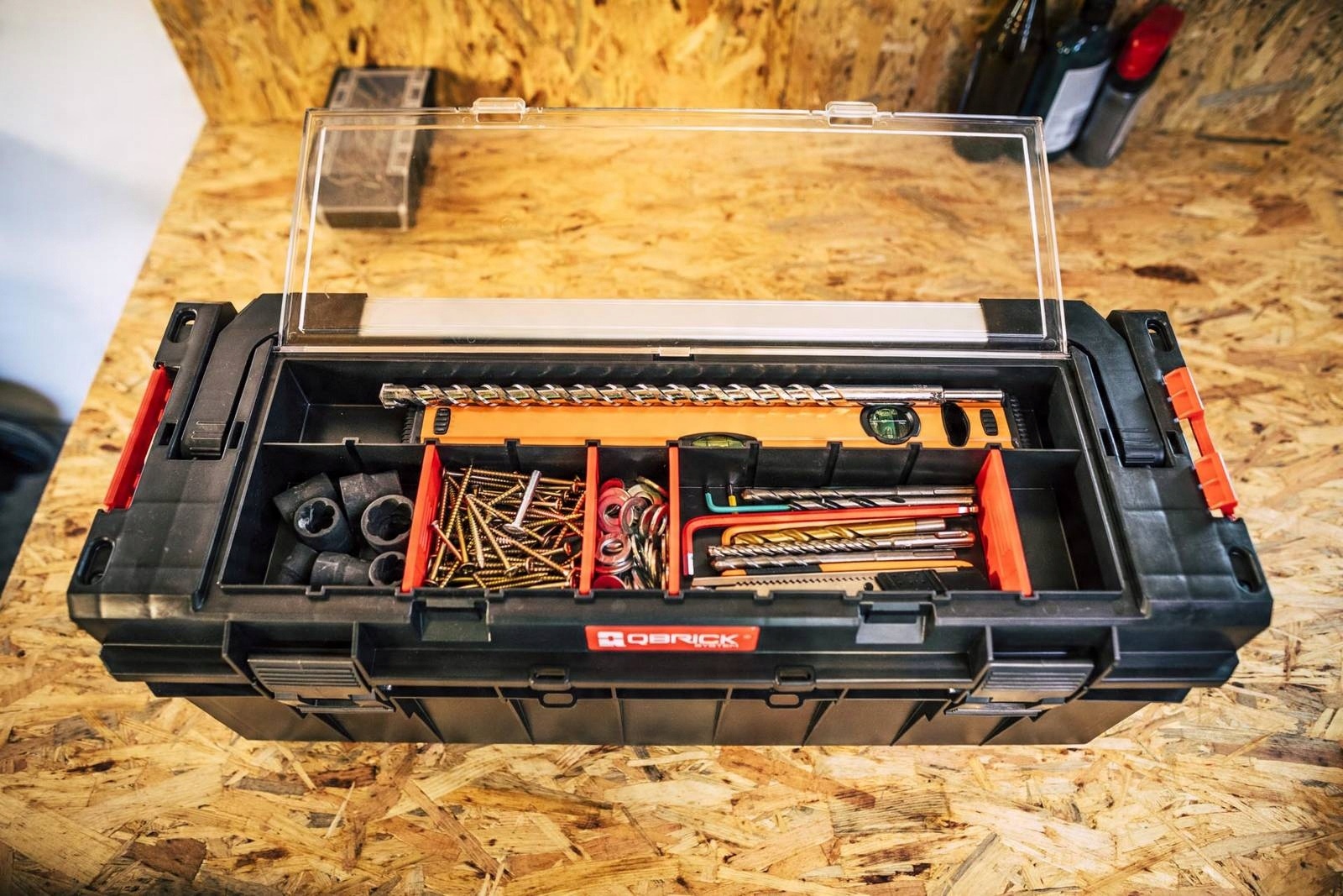 Великий органайзер Expert, розташований у кришці коробки, має 11 відділень із регульованими роздільниками та може легко вмістити водяний рівень, довгий свердла та менші аксесуари.