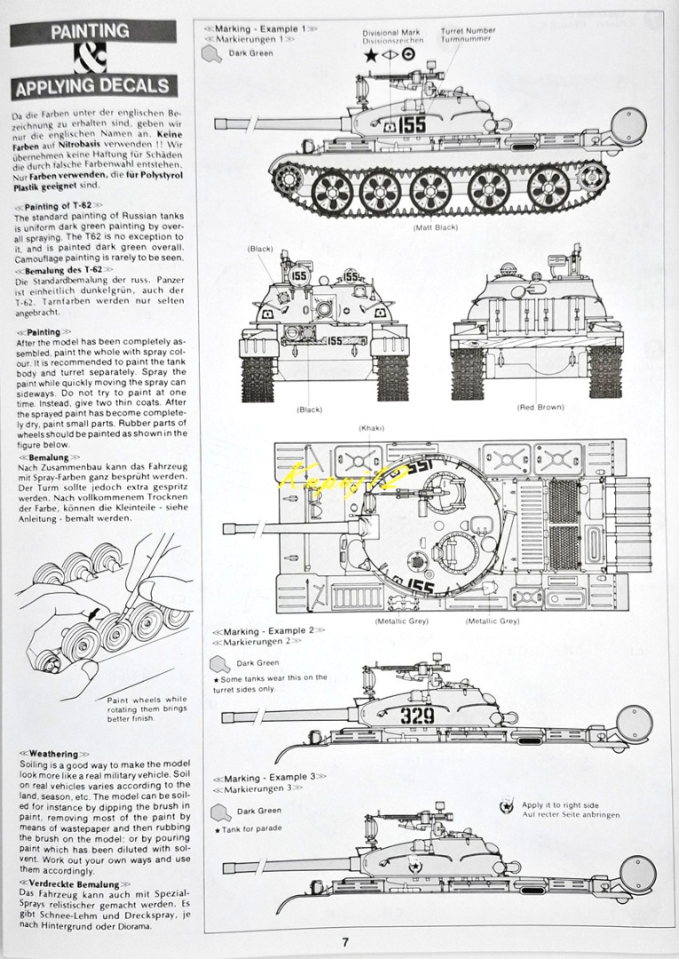 Набір включає пластикову модель для приклеювання. Радянський танк T-62A+ фарба, фундамент, лак. Шкала Тамії 1:35 та набір додавання -он для її обробки.