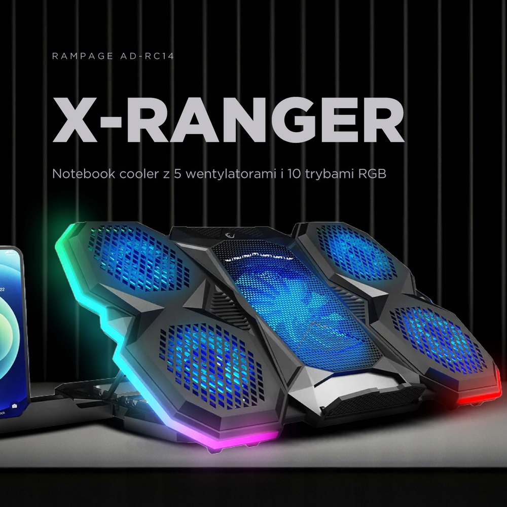ad-rc14 x-ramger Rampage-це сучасна підставка для охолодження, призначена для ноутбуків від 9 до 17 дюймів. Оснащений п'ятьма вентиляторами, включаючи один діаметр 125 мм і чотири менші 70 мм, забезпечує ефективне охолодження навіть під час інтенсивного використання. Додатковий підсвічування RGB з десятьма режимами надає естетичний вигляд і підкреслює ігровий характер пристрою.