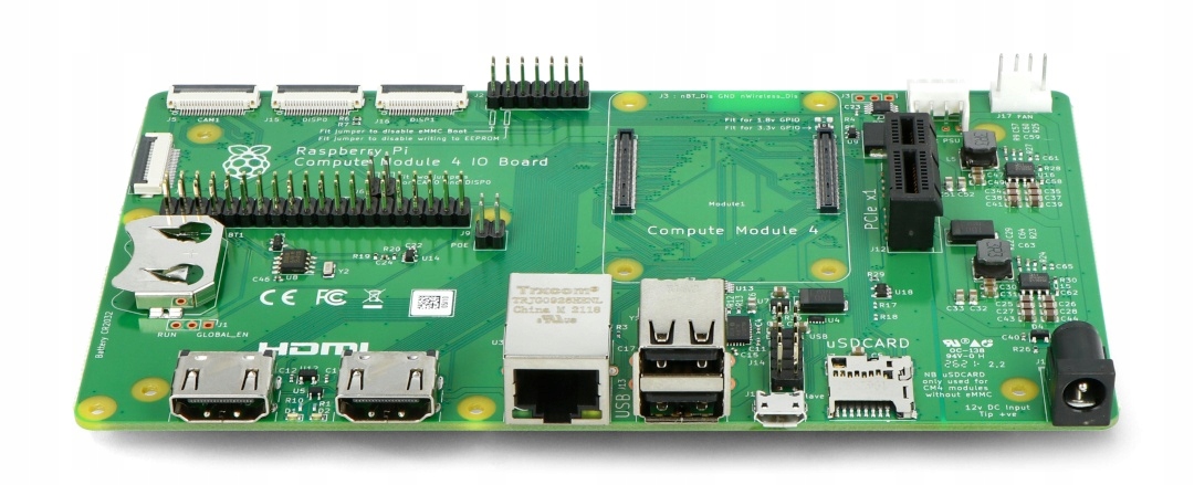 Модуль розширення, призначений для мініатюрної версії Raspberry Pi 4B у вигляді модулів Compute Module 4. Він дозволяє підключати свої роз’єми до контактів GPIO. Крім того, він має два роз’єми HDMI, Gigabit Ethernet, два роз’єми USB, роз’єм живлення постійного струму, роз’єми камери та екрана, RTC і слот PCIe.