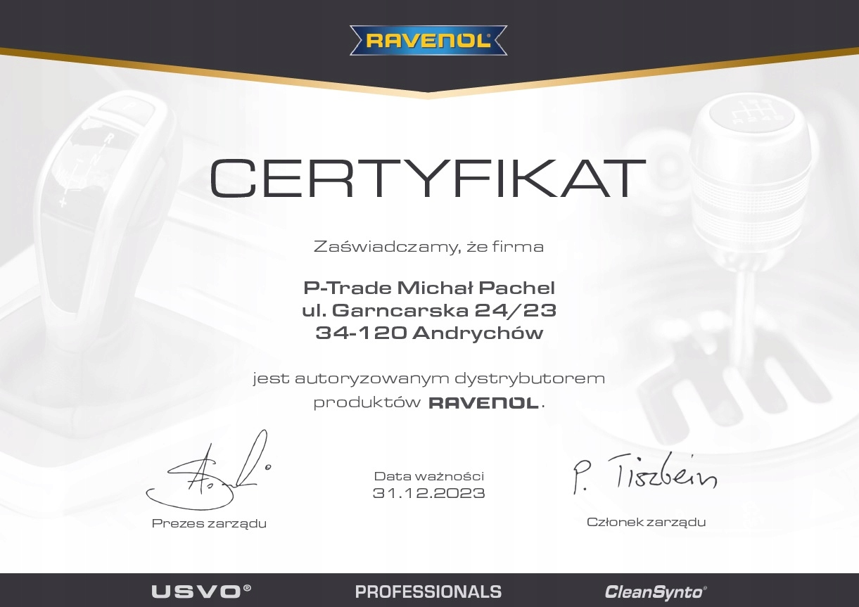 Ми є авторизованим партнером Ravenol, ви можете знайти нас на сайті Ravenol Polska в розділах «Партнери» та «Де купити». Купуючи у нас, ви можете бути впевнені, що масло є 100% оригінальним і походить з польської дистрибуції.